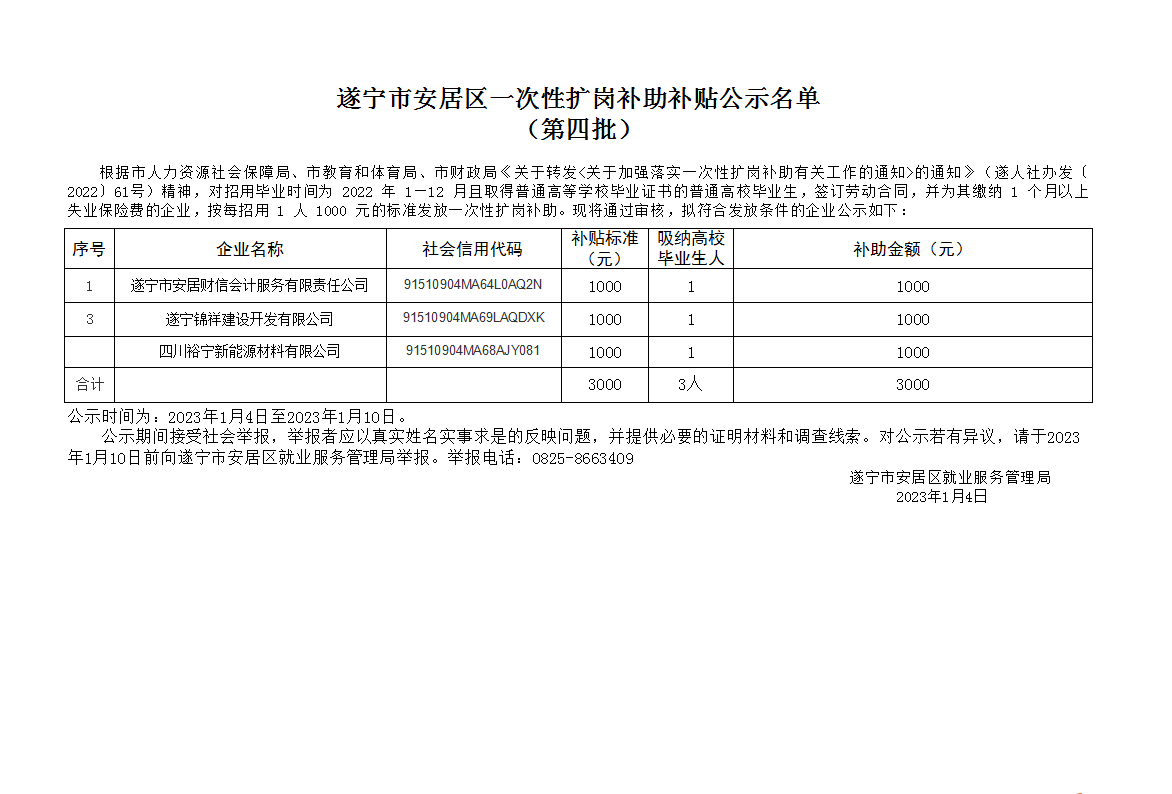 遂宁市安居区一次性扩岗补助补贴公示名单 (第四批)