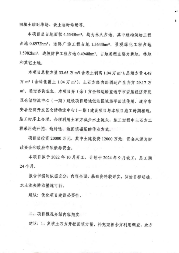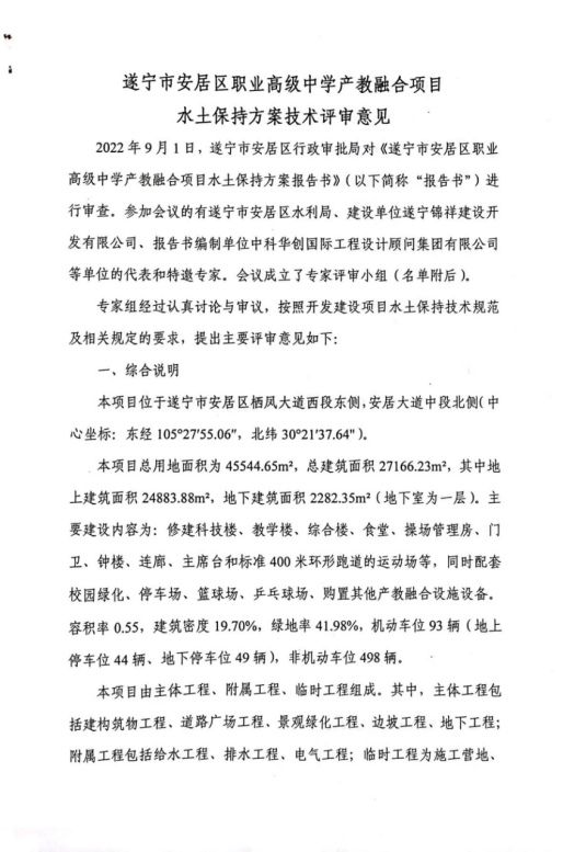 你单位报送的《遂宁市安居区职业高级中学产教融合项目水土保持方案报告书(报批稿)》(以下简称《报告书》)等相关资料已收悉。我局组织相关专家对《报告书》进行了审查。区水利局、区行政审批局相关负责人,建设单位遂宁锦祥建设开发有限公司和《报告书》编制单位中科华创国际工程设计顾问集团有限公司相关代表参加了审查会。编制单位根据专家审查提出的意见对《报告书》进行了修改完善,并上报我局。经研究,现批复如下: