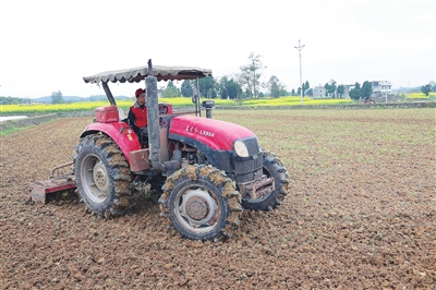 日前,记者在安居区三家镇八角井村看见,田坎间一块块农田连成片,旋耕机正“扎”在田地里,操作人员坐进旋耕机的驾驶室,开动机器来回作业。没过多久,一大片土地被翻整一新,露出了褐红色的土壤。图为现代化农机助力春耕生产