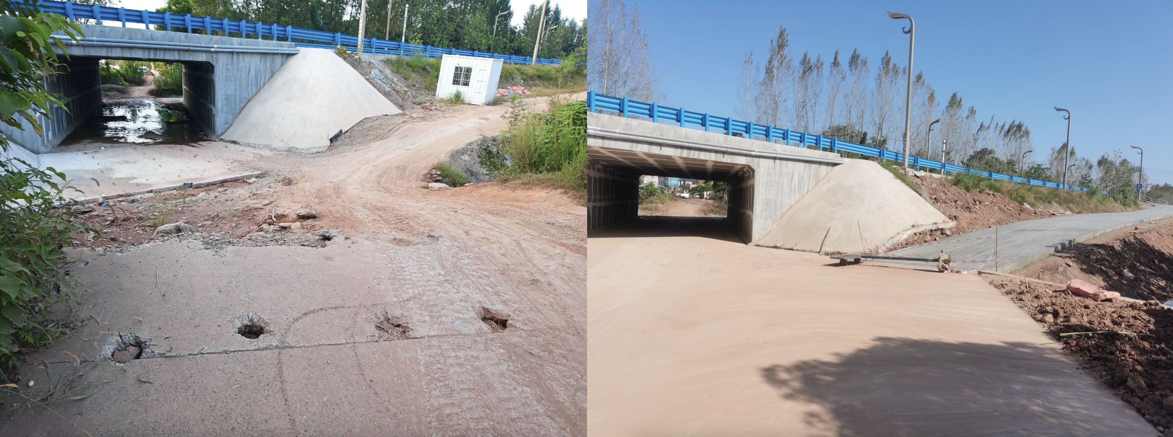 图为村民反映的宝珠寺村与快速通道连接处道路,左图为施工前,右图为施工后。