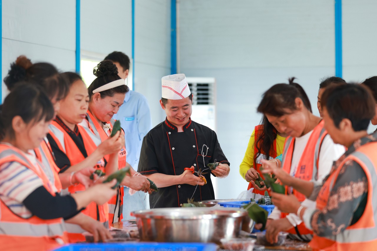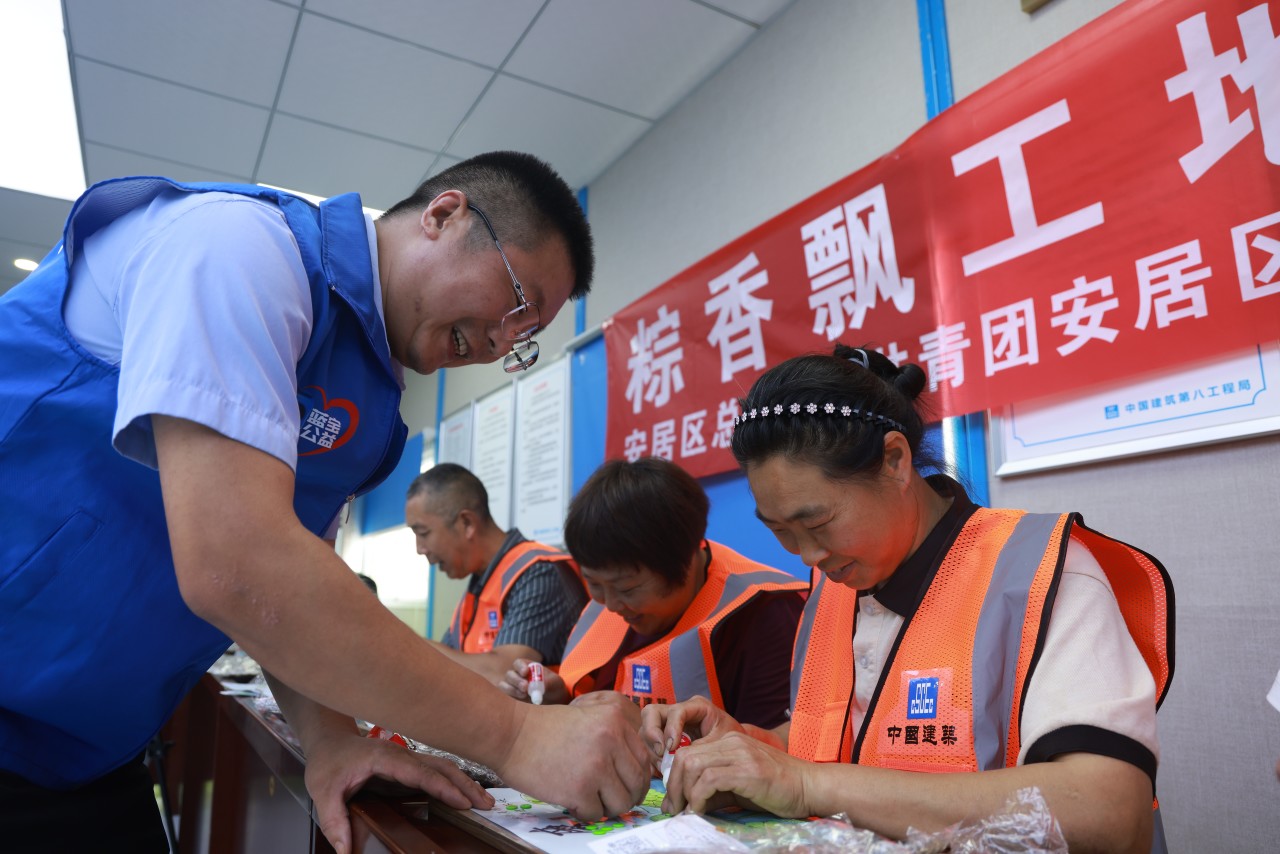 活动现场,糯米、粽叶、蜜枣等食材整齐摆放,平日里与钢筋水泥打交道的工友们化身“包粽能手”,巧手翻飞间,一个个饱满的粽子逐渐堆满竹筐。在欢声笑语中,工友们还参与了艾草香囊DIY、端午谜语竞猜等趣味活动,在欢乐的氛围中感受传统文化的独特魅力。
