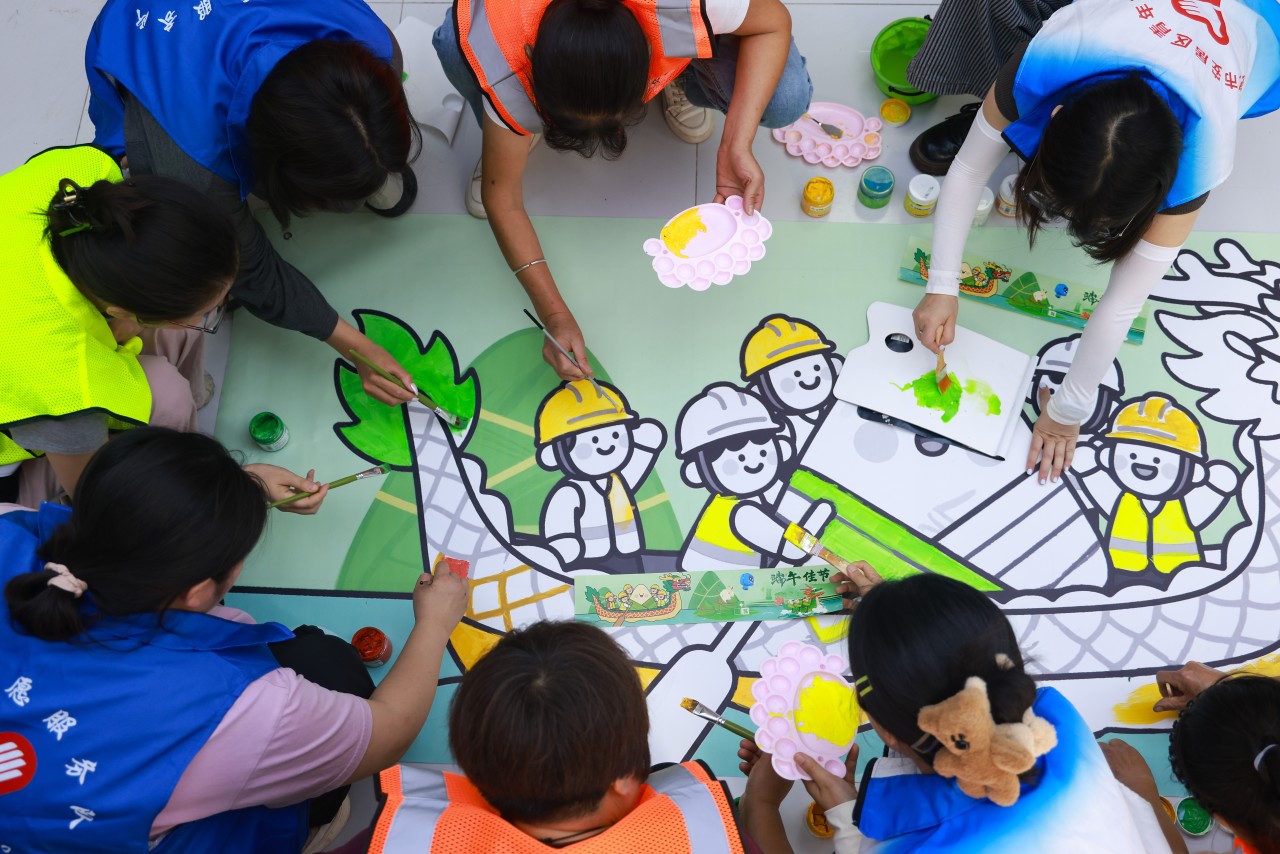 最特别的当属“安全龙舟”创意绘制环节。工友们用五彩颜料在画布上描绘出栩栩如生的龙舟竞渡场景,经过大家齐心协力的涂色创作,一幅充满端午韵味的主题画卷完美呈现,为施工现场增添了浓厚的节日氛围。