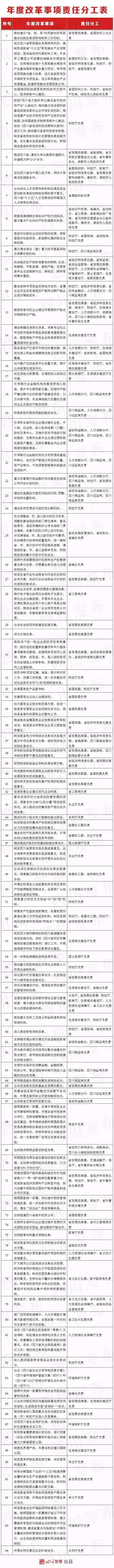 年度改革事项责任分工表显示,今年的改革任务将分解给成都、绵阳、德阳市政府,以及省发改委、省住建厅、四川银监局、省医改办等50个部门,其中多个改革事项由数个部门共同负责。意见称,联动机制将确保重点领域改革的协同配套,避免单兵突进和碎片化。