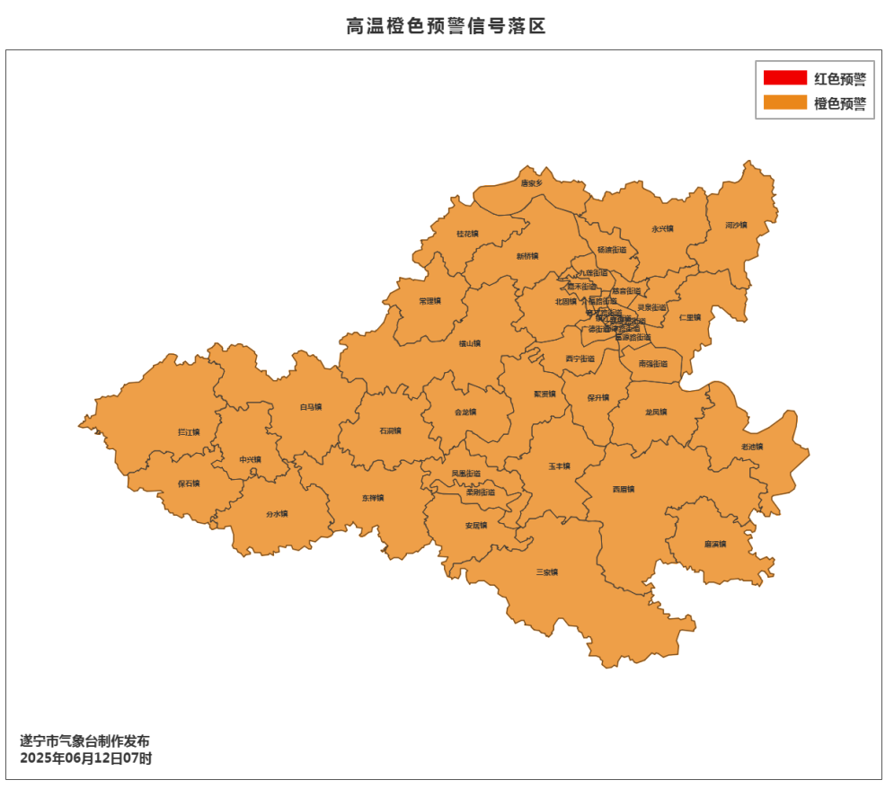 遂宁市气象台2025年6月12日7时25分发布高温橙色预警信号:预计今天白天安居区大部地方最高气温将升至38℃以上。请做好防暑降温、电力调度、水资源调配、安全生产和臭氧污染防控等工作。