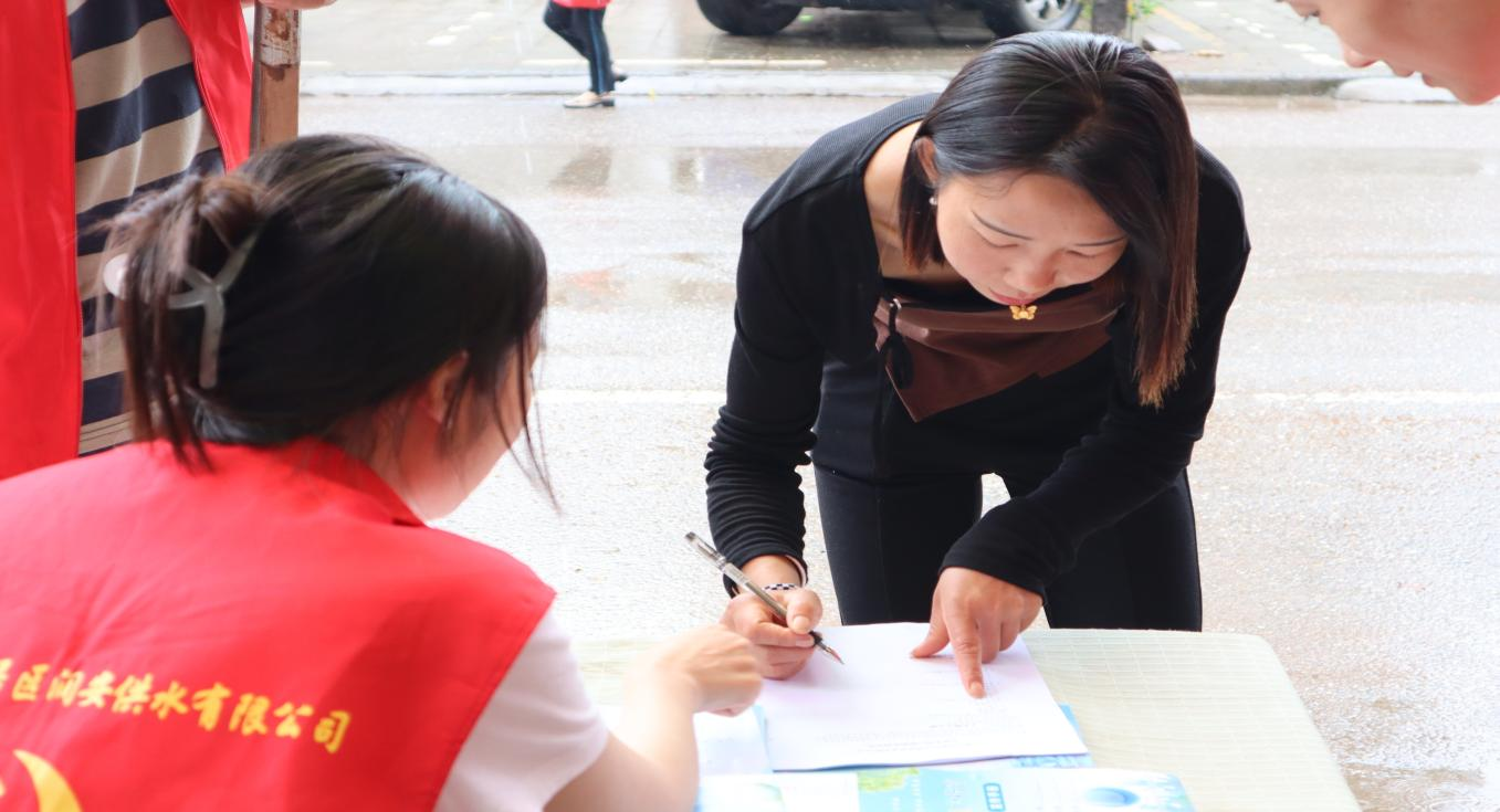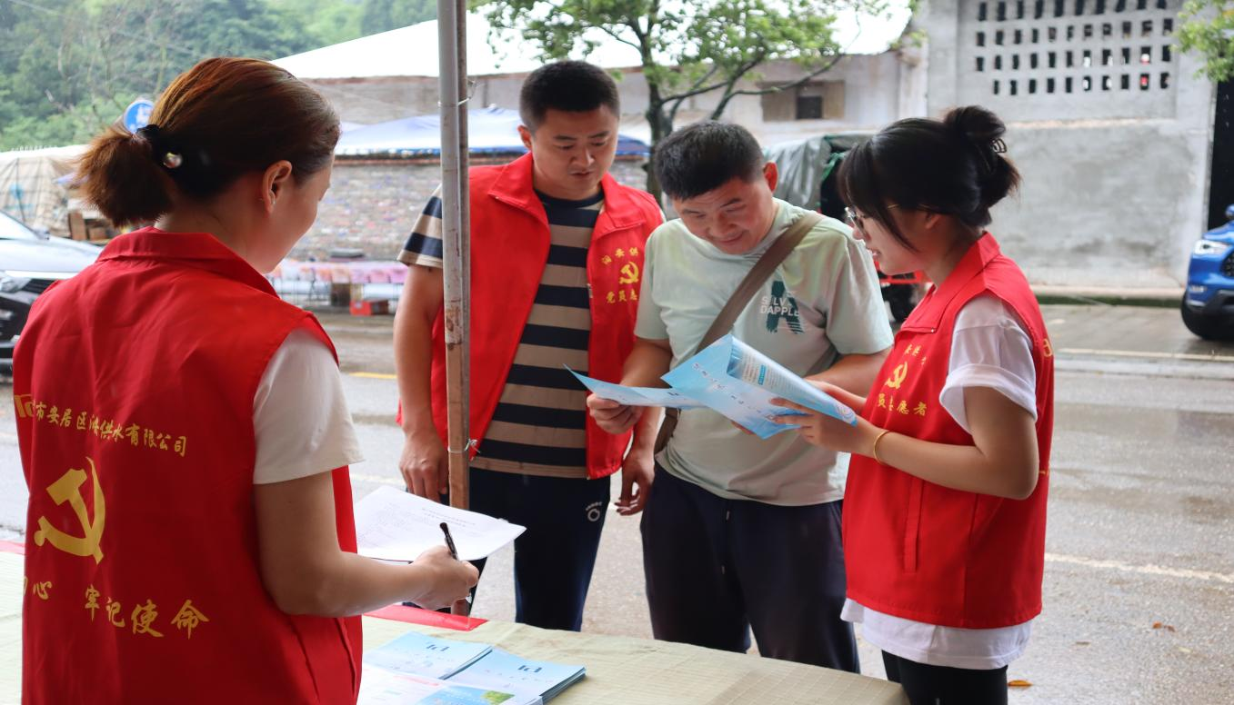 本次活动为解决实际问题,将“服务窗口”搬到了“家门口”,设立三家镇、玉丰镇、拦江镇、白马镇四个集中宣传展台点位,其他供水场镇由供水站组织人员以入户走访形式宣传。