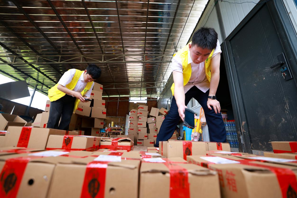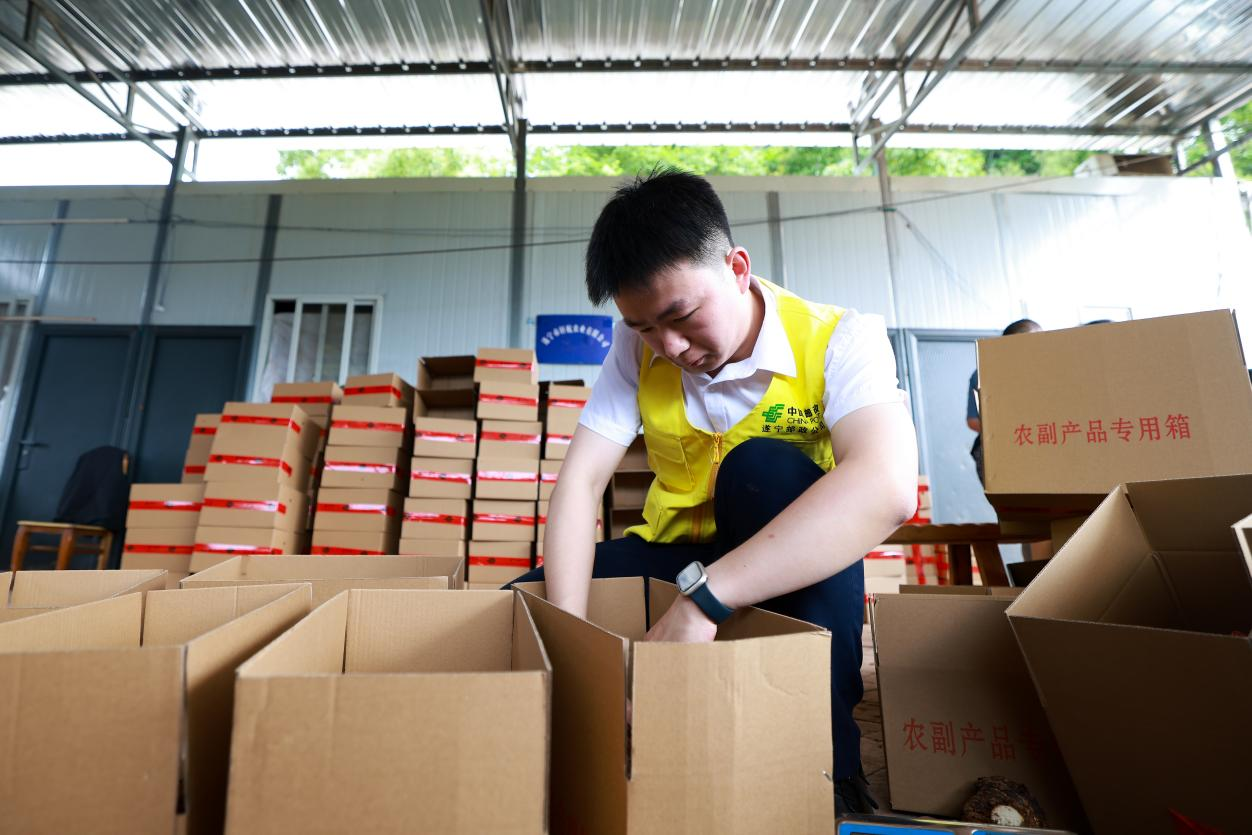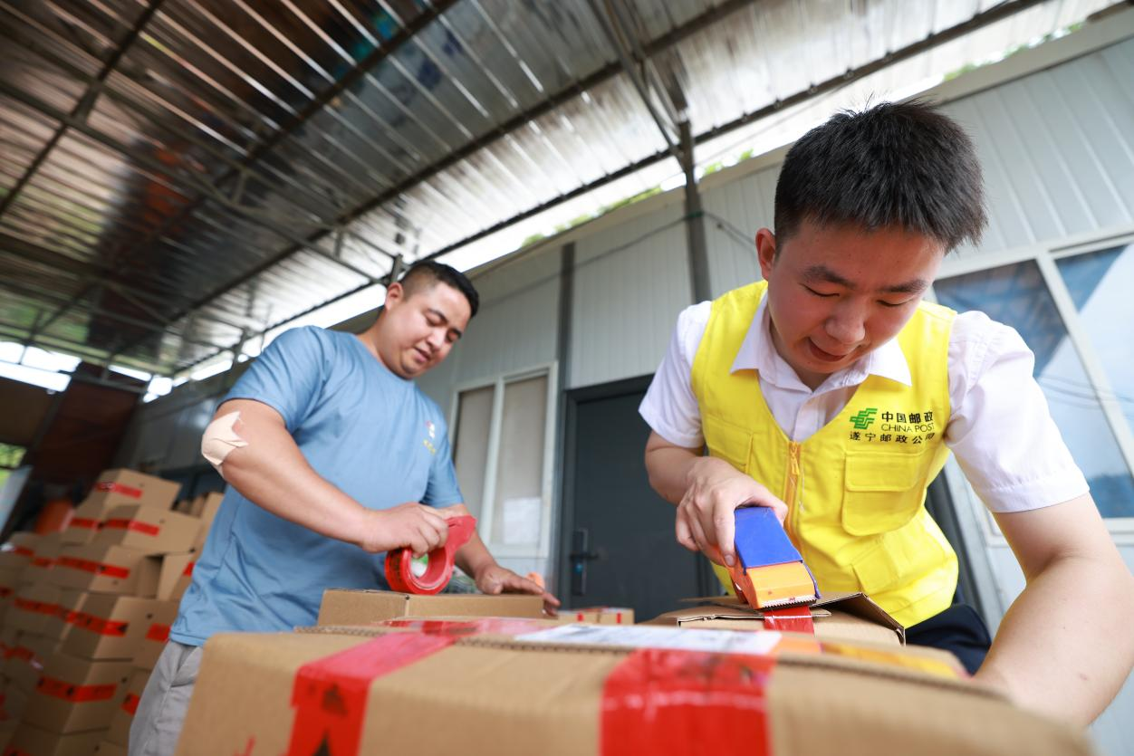 而在穿梭忙碌的公司员工中,两抹格外醒目的“亮黄色”身影尤为引人注目——他们是中国邮政集团有限公司遂宁市安居区分公司的工作人员。今年“五一”前后,他们便常驻于此,全力协助轩航农业进行农产品分装与发货。