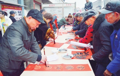 在春节即将来临之际,1月21日,遂宁市委老干部局组织市本级老干部、安居区老干部、市老年书画研究会书法家代表在保石镇举行了老干部第十二届送春联下乡活动。活动现场,十余名老干部、书法家们现场挥毫泼墨,饱含热情地为广大群众书写带着浓浓年味、寓意吉祥的春联,用自己手中的毛笔将真挚的祝福送到群众的心中。图为老干部给群众写春联