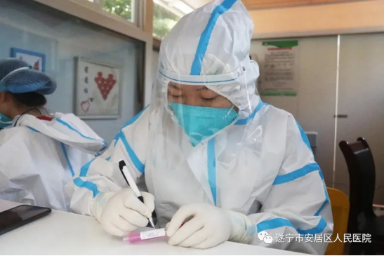 在进行采样工作时,医务人员需身着防护服加隔离衣,佩戴N95口罩、一次性防护手套及护目镜,在高温天气的影响下,穿着不透气的防护服工作,犹如“蒸桑拿”,即使不动也会全身出汗。