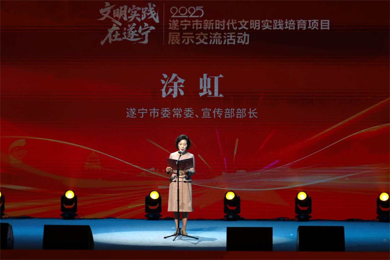 10月28日下午,2025年遂宁市新时代文明实践培育项目展示交流活动在安居区凤凰大剧院举行。市委常委、宣传部部长涂虹出席活动并致辞。市委宣传部、市文明办、市委社会工作部、团市委分管负责同志,各县(市、区)党委宣传部主要负责同志、市直园区分管负责同志、新时代文明实践所相关负责同志,以及志愿者、志愿服务组织、群众代表参加活动。