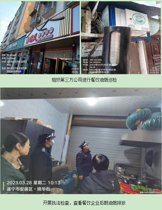 一是组织全面巡检,回收问题仪器。组织柔刚街道(云上派格)和凤凰街道(宇联智行)两家油烟在线监控安装公司,对各自辖区已安装的51家和39家餐饮企业进行全面巡查,清理过滤机芯和探头,回收已关停的餐饮企业的油烟监控设备,对已转让的餐饮企业设备的名称做好更名,并建立台账。二是坚持问题导向,及时督促整改。配合市局数管中心,做好对油烟系统的预警处理。针对部分餐饮企业油烟排放超标的问题进行现场核实,积极沟通负责人,督促餐饮企业配合整改。三是加强执法检查,查处违法行为。各中队至少开展每月一次对餐饮油烟的执法检查,做好监督管理,对油烟排放超标的餐饮企业督促整改,根据《中华人民共和国大气污染防治法》相关规定查处整改未见实效的餐饮企业。