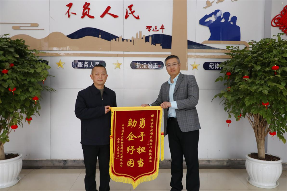 “非常感谢,项目建设关键期拖不得!”2月28日上午,四川创晨兴能新材料科技有限公司为区综合行政执法局送来了一面印有“勇于担当 助企纾困”的锦旗,对用心为企业办实事、解难题表达衷心地感谢。
