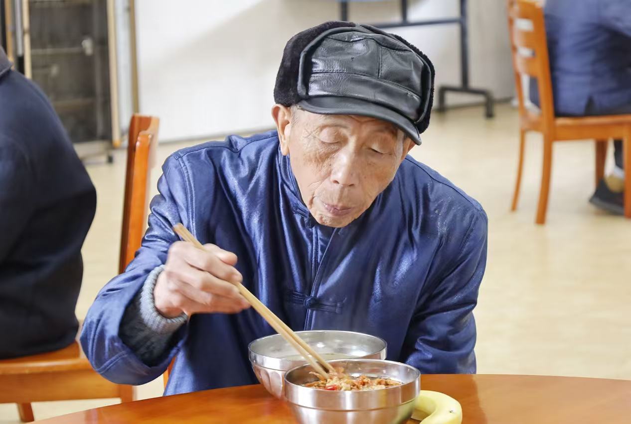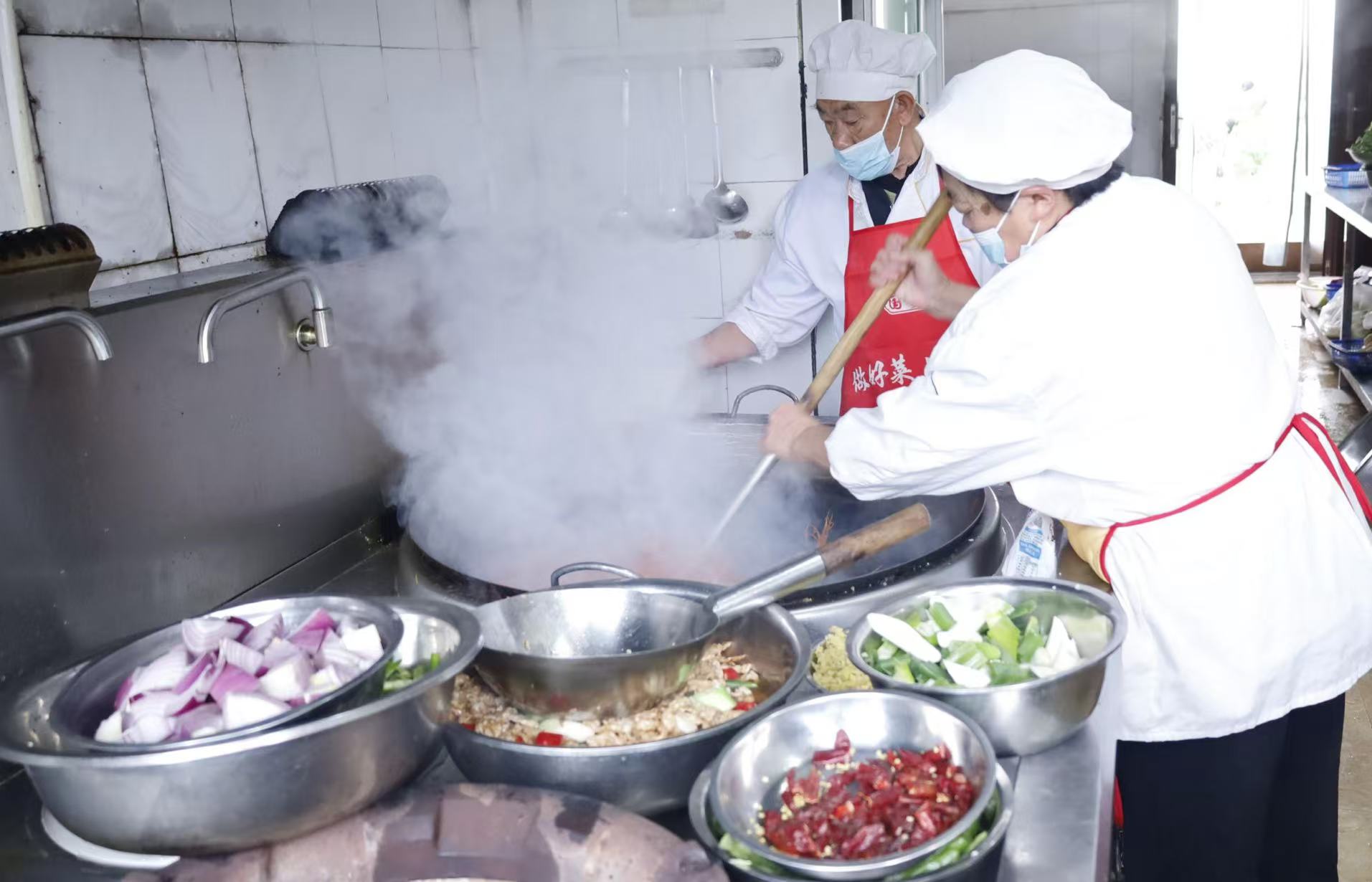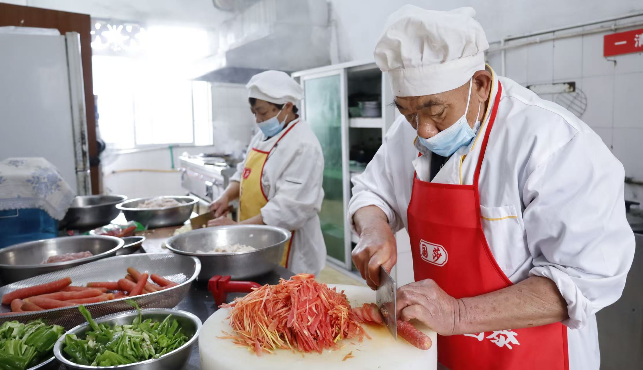 上午11点,在白马镇中心敬老院的厨房里,厨师们正忙碌着准备老人们的午餐。洗菜、切菜、热锅下油,手法娴熟。胡萝卜炒肉、回锅肉、绿豆排骨汤……一道道荤素搭配、营养均衡的菜肴火热出锅,老人们依次排队盛好饭菜后,便开始享用丰盛的午餐。