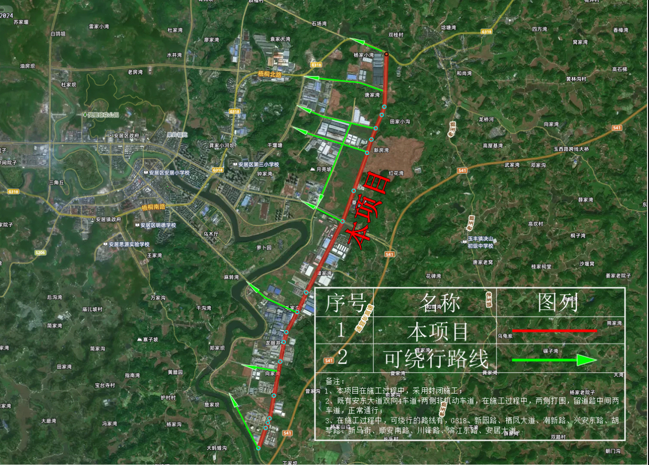 因遂宁高新技术产业园区装备制造园基础建设及道路改造工程、遂宁天齐绿色低碳产业园基础设施建设项目(二期)(二标段)(安东大道提升改造)建设需要,将对该路段进行封闭施工,为确保工程的顺利实施及周边通行车辆和人员的交通安全,根据《中华人民共和国道路交通安全法》的有关规定,现将有关事项通知如下: