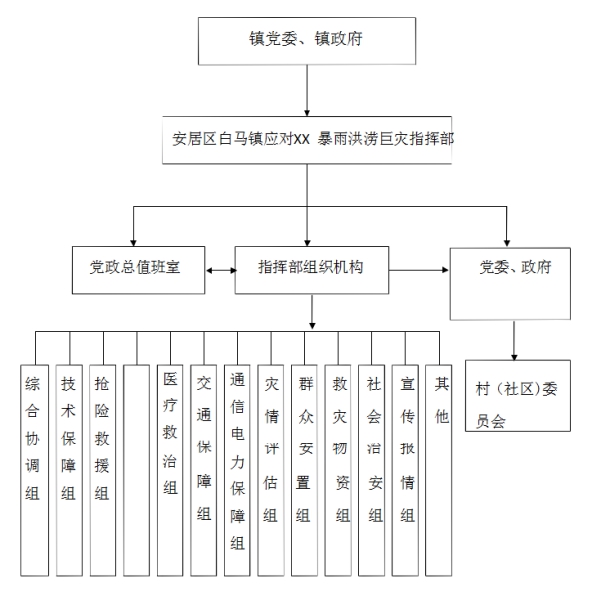 遂宁市安居区白马镇应对暴雨洪涝巨灾指挥部(以下简称镇指挥部)在镇党委领导下,由镇长担任指挥长;相关镇领导和人武部部长任副指挥长;镇直各部门负责人、各村支部委员会书记为成员。镇指挥部下设综合协调组、技术保障组、抢险救援组、医疗救治组、交通保障组、通信电力保障组、灾情评估组、群众安置组、救灾物资组、社会治安组、宣传舆论组等工作组,承担抢险救援等具体工作。