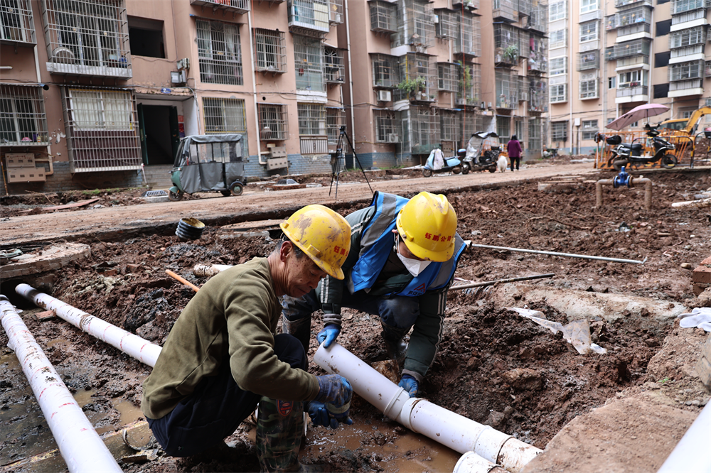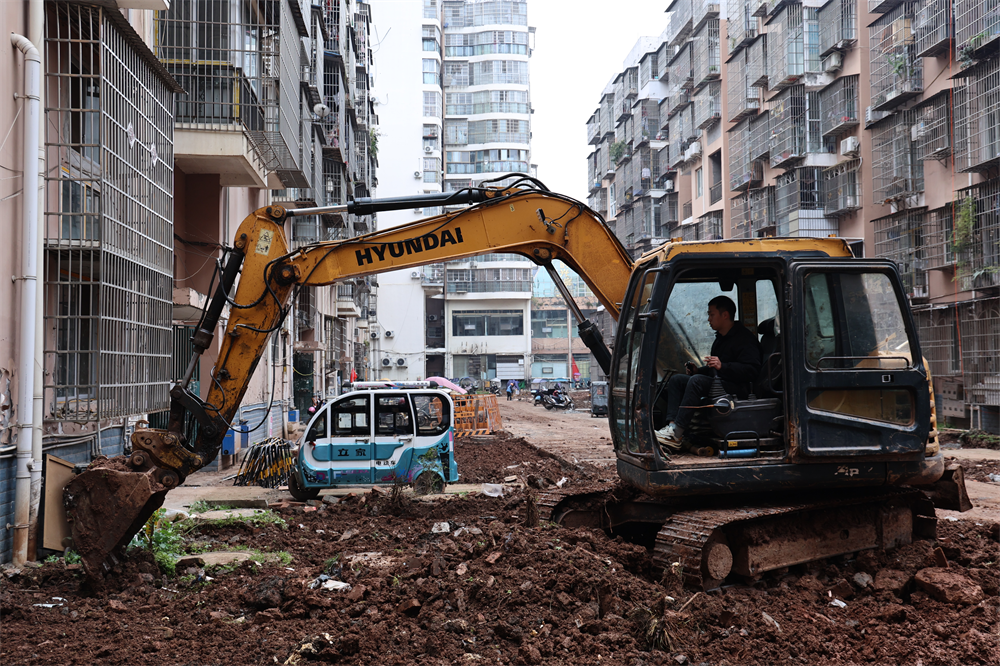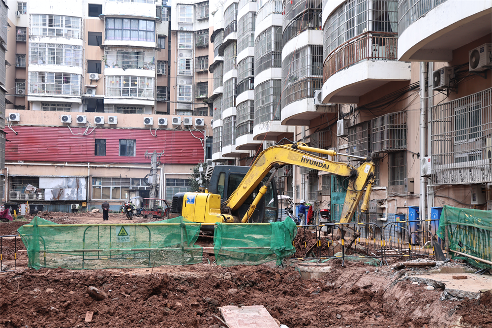 在丽景金海岸老旧小区改造项目施工现场,数台挖掘机轰鸣作响正开挖管沟,工人们紧锣密鼓地进行雨污管网铺设和废水池修建。