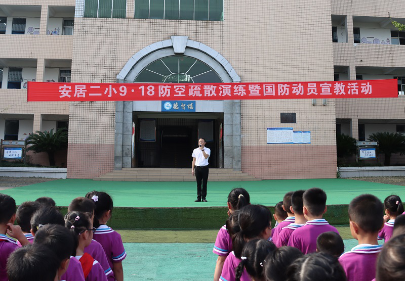 9月18日,安居二小举行了9.18防空疏散演练和国防动员宣教活动。