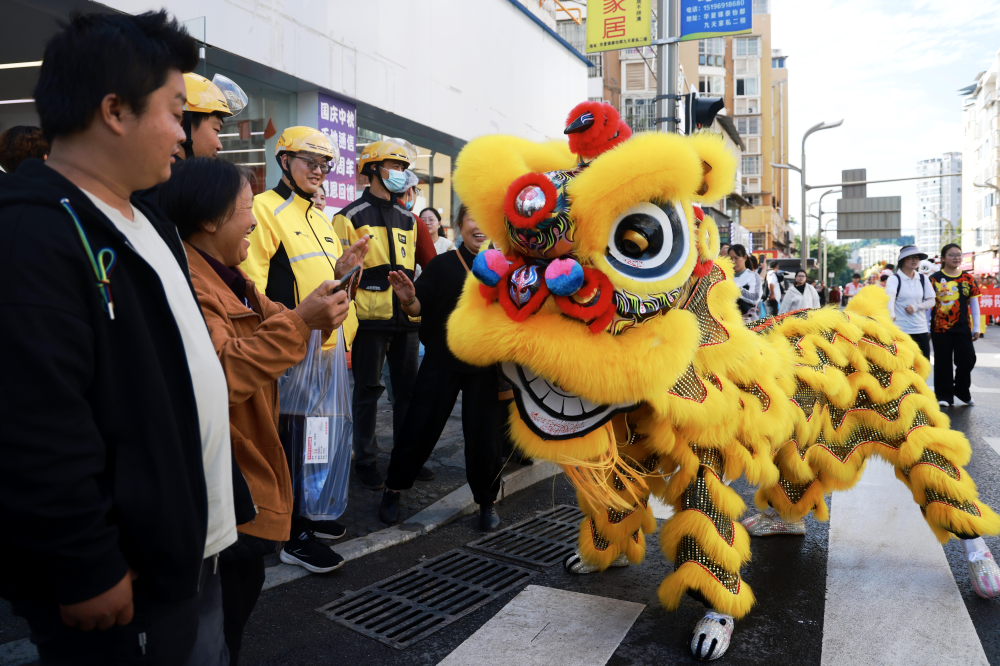街道两侧的人行道挤满了市民,他们热情地伸出手臂,与巡游而至的狮头击掌,欢呼声与掌声交织,现场气氛热闹非凡。