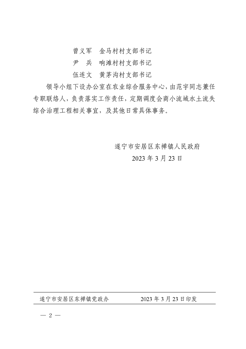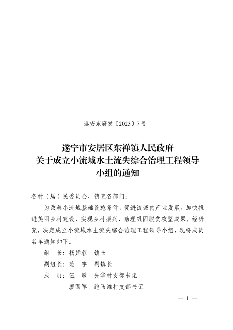 遂宁市安居区东禅镇人民政府 关于成立小流域水土流失综合治理工程领导 小组的通知