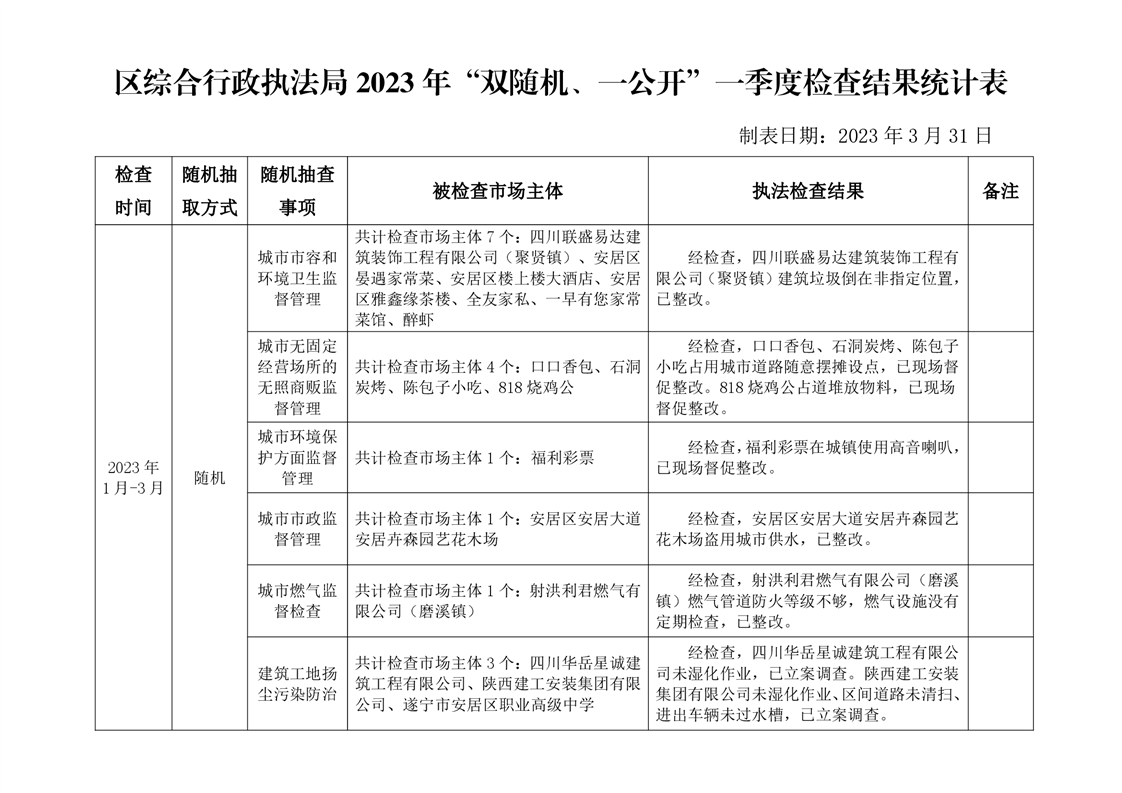 区综合行政执法局2023年“双随机、一公开”一季度检查结果统计表