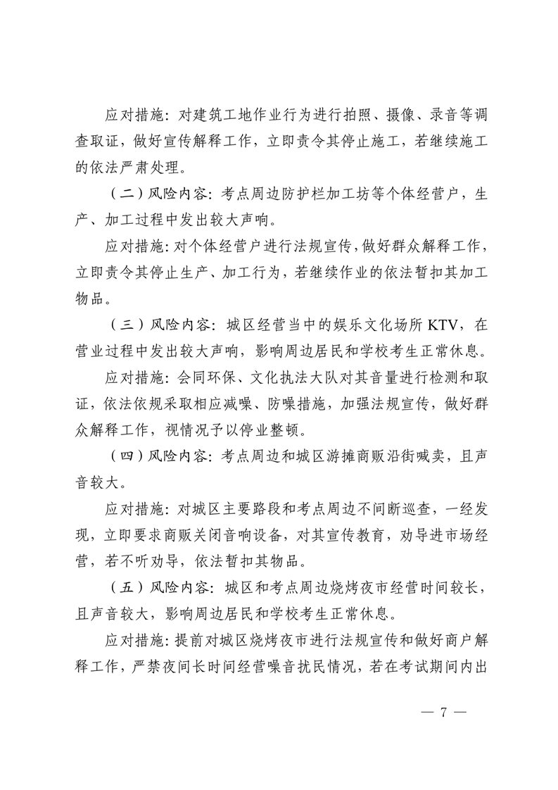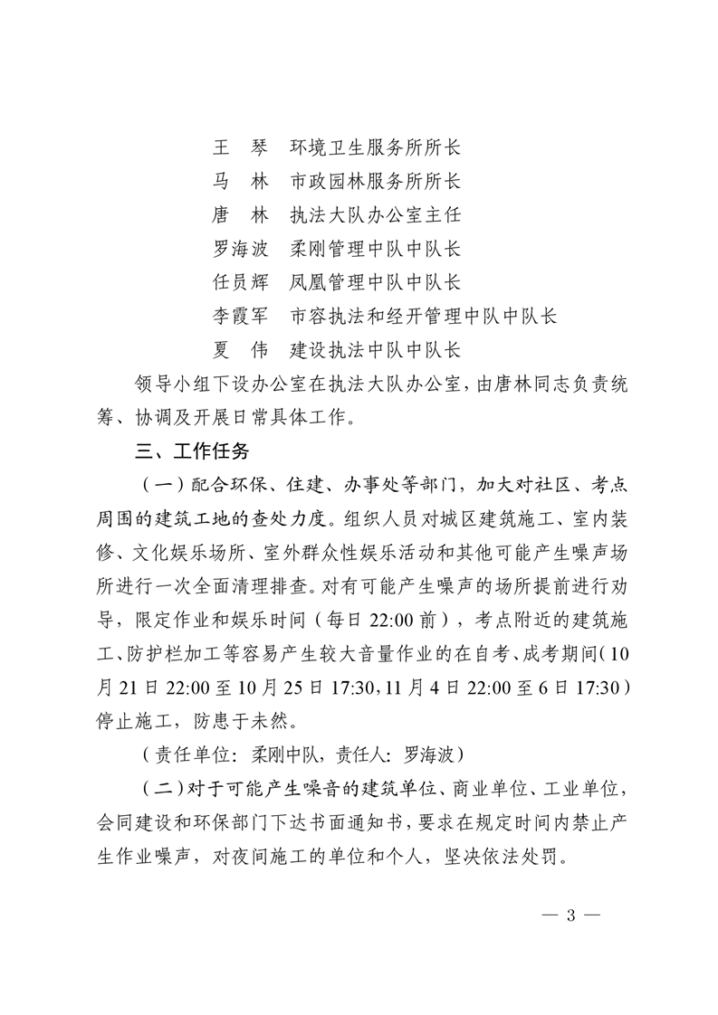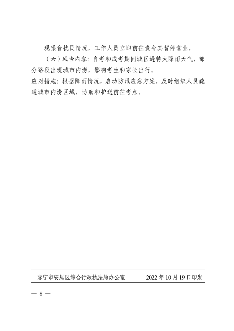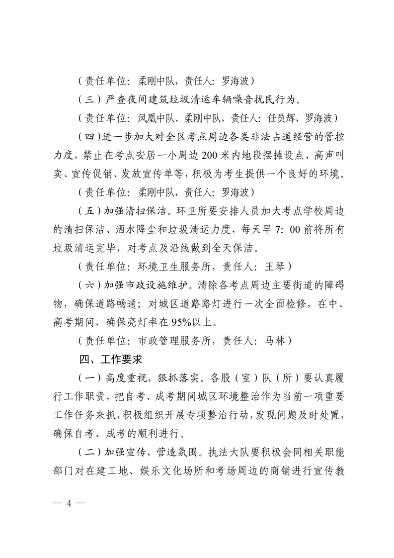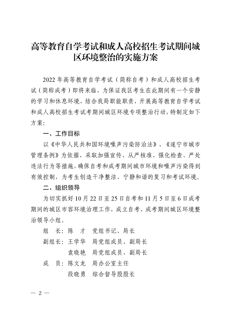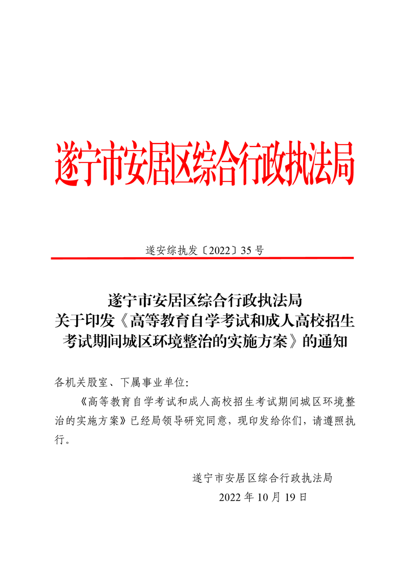 遂宁市安居区综合行政执法局关于印发《高等教育自学考试和成人高校招生 考试期间城区环境整治的实施方案》的通知