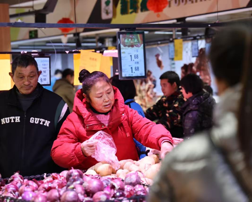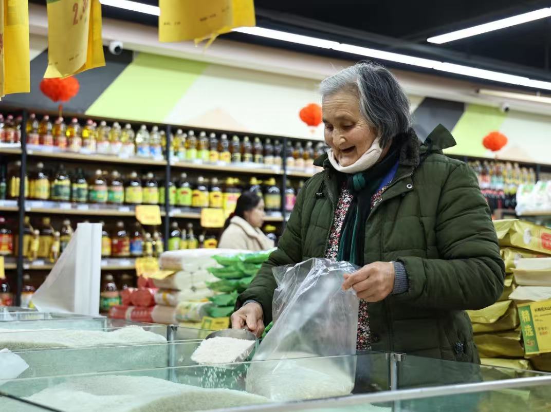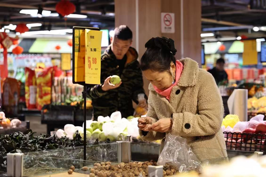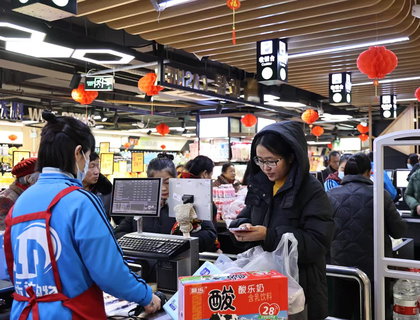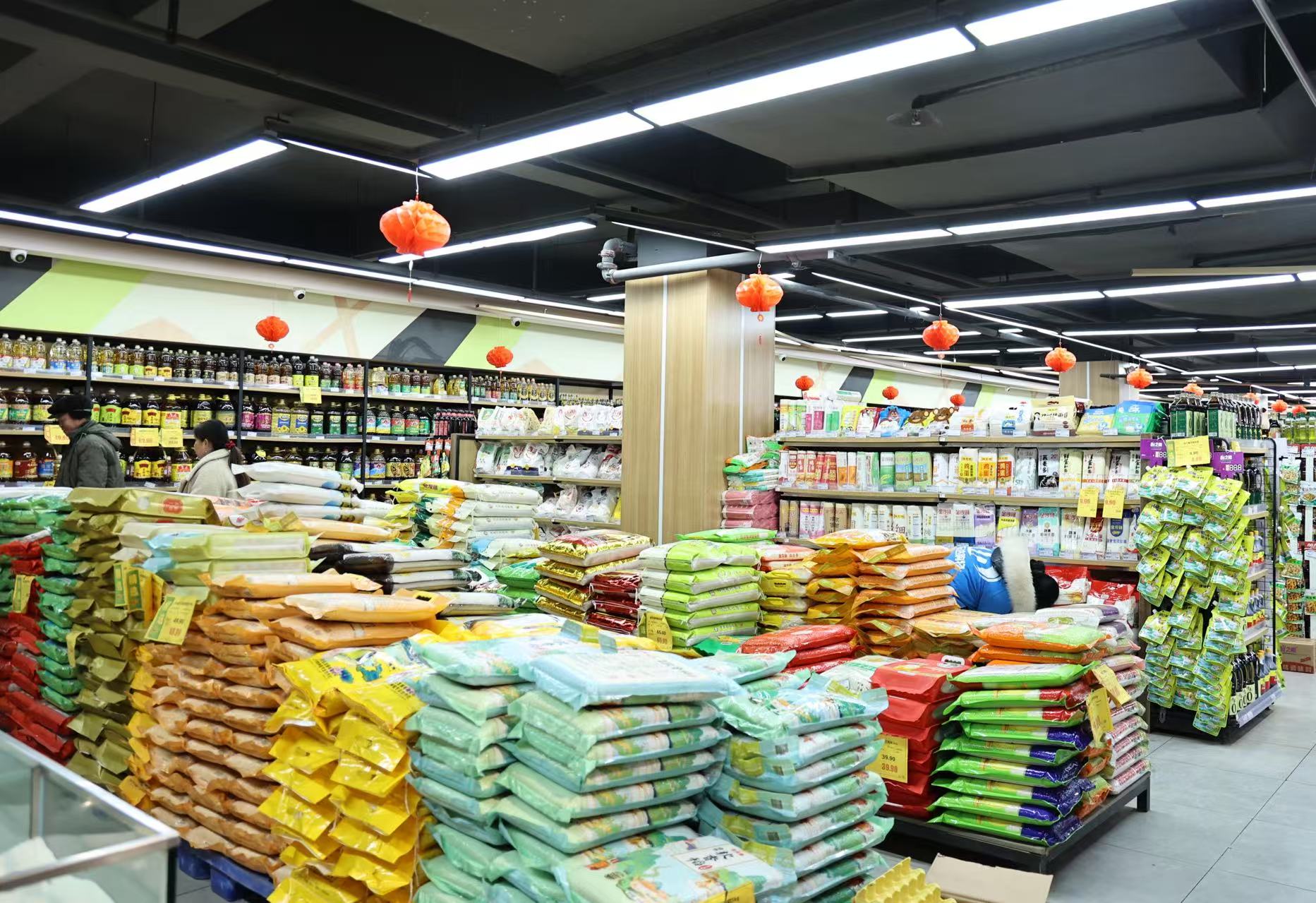 在安居区乐达购物广场,货架上摆满了各类年货,新鲜蔬菜、水果和米面粮油区的商品种类丰富、数量充足。市民们穿梭在货架之间,有序选购。