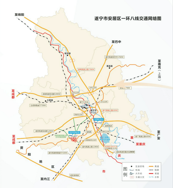 航空:至成都、重庆、绵阳、南充机场均不足1.5小时车程;4C级安居通用机场建成后将成为川东与渝西结合部的区域航空货运枢纽。