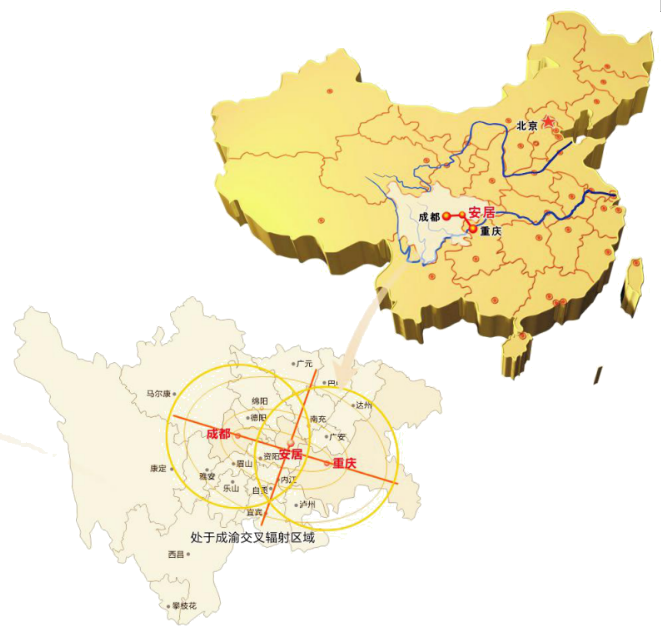 以安居为中心120公里半径内辐射2个特大城市(成都、重庆),14个大中城市(遂宁、南充、广安、绵阳、德阳、资阳、内江、自贡、壁山、北碚、合川、铜梁、大足、永川),40余个县级城市,总人口1.5亿,消费市场逾万亿。