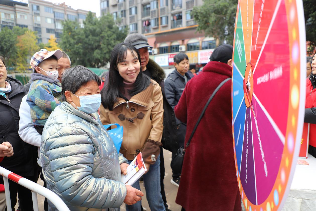 “我国的根本大法是什么?”12月4日,安居区头陀寺广场热闹非凡,宪法知识问答转盘前围满了踊跃参与的群众。转盘指针停下,“宪法”二字从一位老人口中清晰答出,答对后老人开心地领取了法治小礼品。