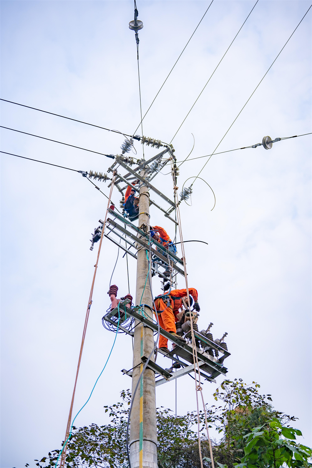 时至冬日,安居区的田野间已带着寒意,但在一排排电线杆下,身着橙色工装的电力工人们正干得热火朝天。“安全带检查好,注意脚扣位置!”近日,在分水镇,明星电力安居供电分公司组织施工队伍,对辖区内关键的10千伏分竹线、10千伏东分线展开了一场集中大修技改攻坚战。