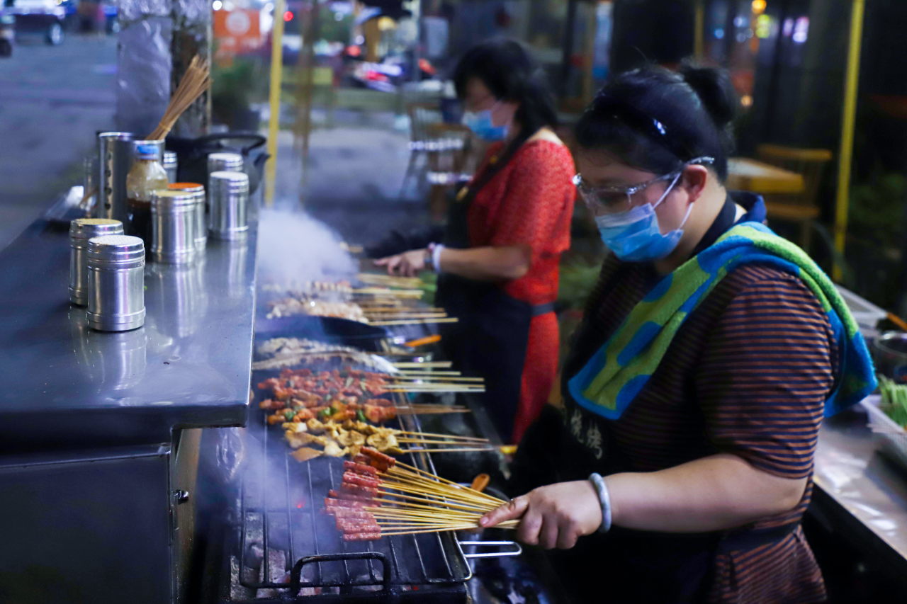 夜幕降临,安居大道东段的香约烧烤店迎来了一天中最热闹的时刻。炭火跃动,烤串飘香,每张桌子都坐满了客人。“我们每天下午5点开门,要忙到凌晨3点才能收摊!”烧烤店老板陶兰一边麻利地翻动烤串,一边笑着说,“生意好,连我放暑假的女儿都主动来帮忙,虽然累,但心里高兴!”