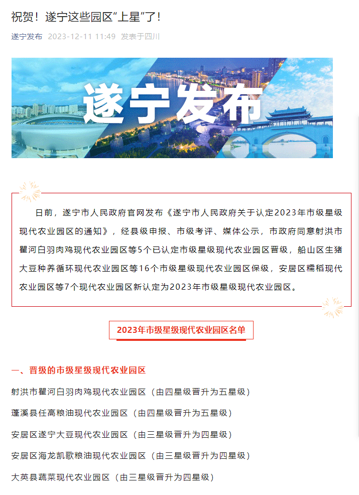 日前,遂宁市人民政府官网发布《遂宁市人民政府关于认定2023年市级星级现代农业园区的通知》,经县级申报、市级考评、媒体公示,市政府同意安居区海龙凯歌粮油现代农业园区等5个已认定市级星级现代农业园区晋级,海龙凯歌粮油现代农业园区由三星级晋升为四星级。