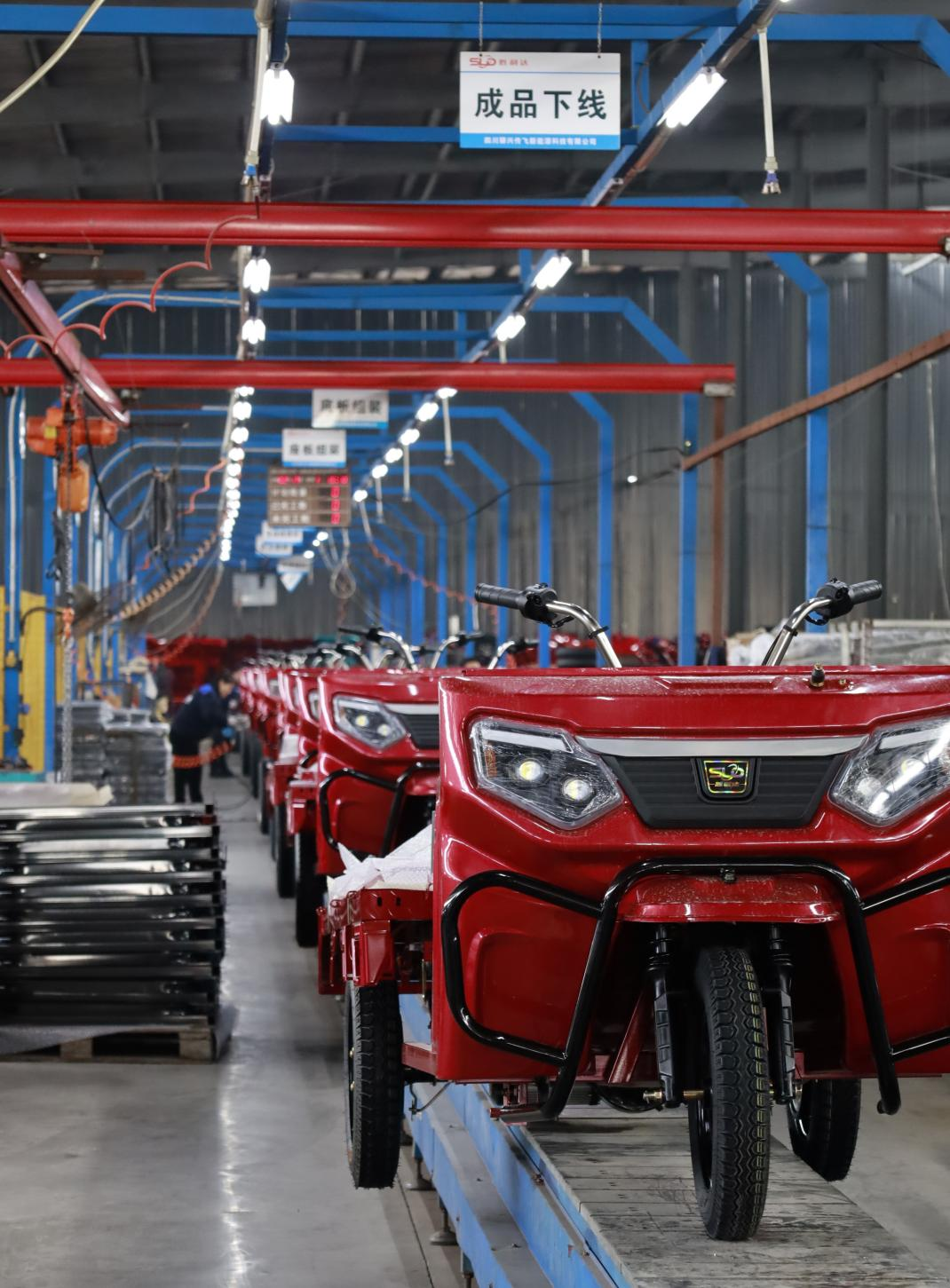 在公司生产车间内,工人们正娴熟地操作机械焊接手臂将车辆的零件焊接在一起,一旁的流水线上,经过内饰、后桥、底盘等零件的精心组装,一辆崭新的电动三轮车便下线出库。
