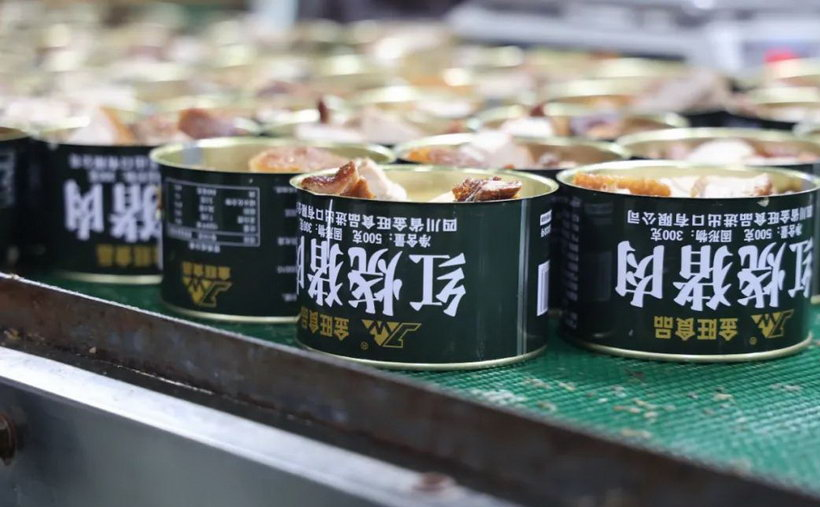 来到四川金旺食品进出口有限公司生产车间内,自动罐装封口生产线正高速运转,清洗干净的新鲜肉类经过绞碎搅拌、称重装罐、密封蒸煮、杀菌冷却等环节后,摇身一变成为了一个个美味可口的午餐肉、红烧肉罐头,经贴标打包后,它们将被装箱发至全国各地。