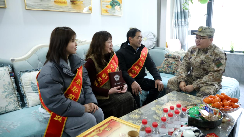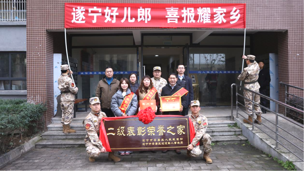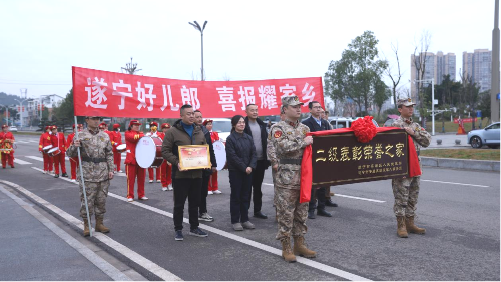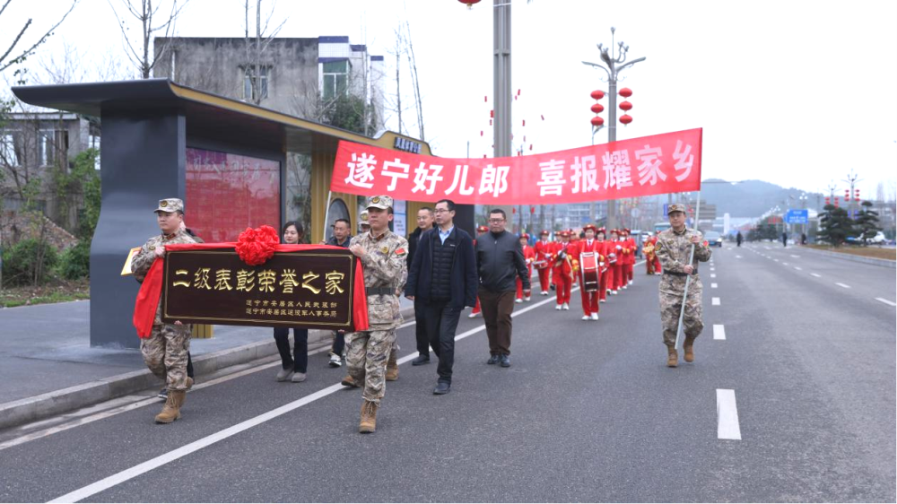 遂宁好儿郎,喜报耀家乡。2月13日,区人武部、区退役军人事务局、柔刚街道办事处组成“报喜团”,为现役军人张鑫家属送去“二级表彰”喜报、慰问金和牌匾,让军人家属共享这份荣耀。