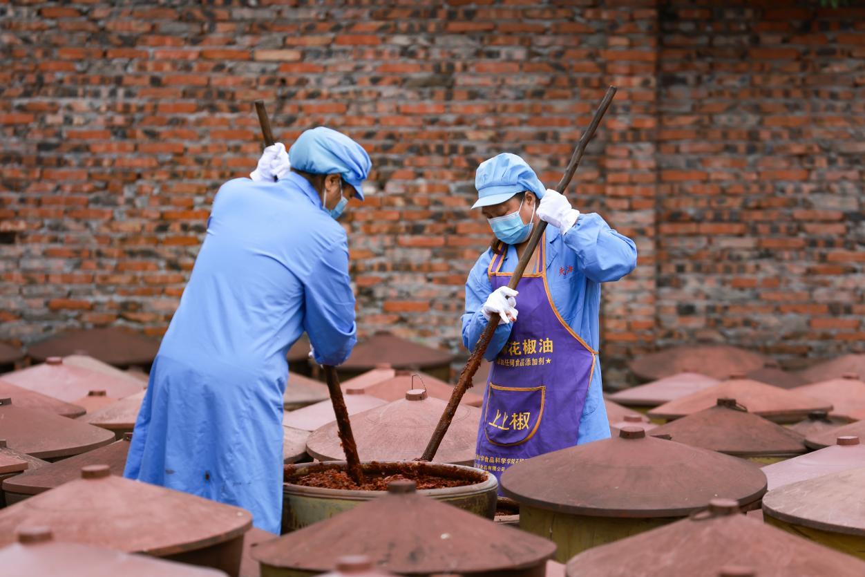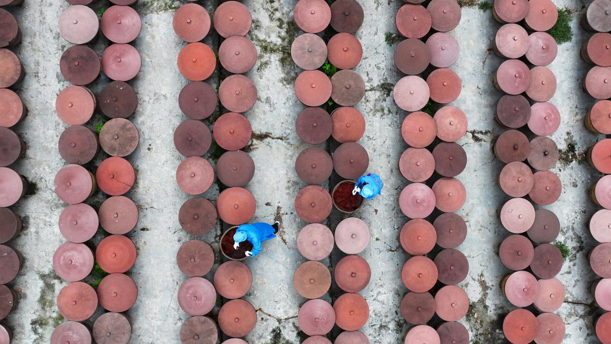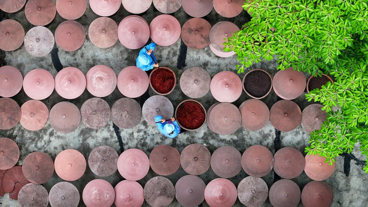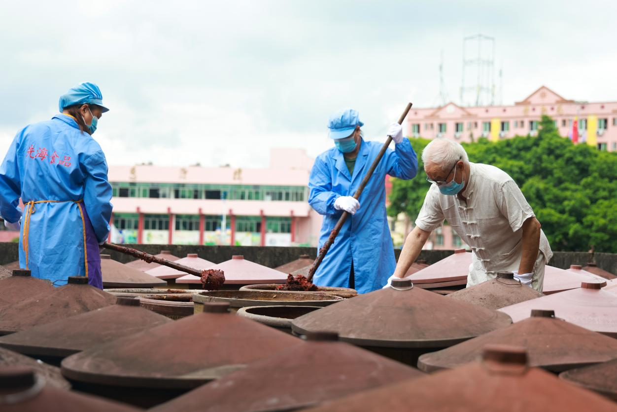 工人们一遍遍翻搅着缸中的豆瓣