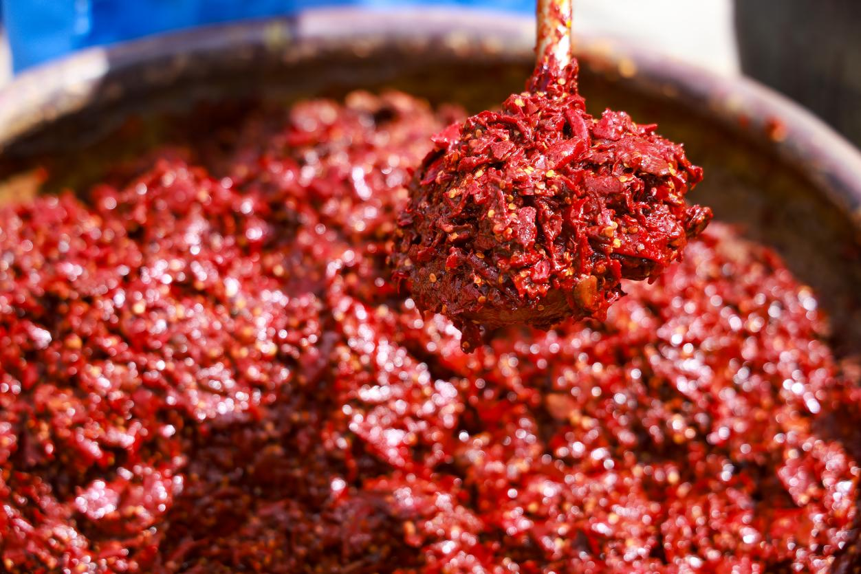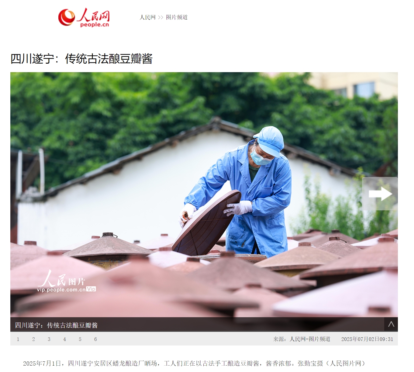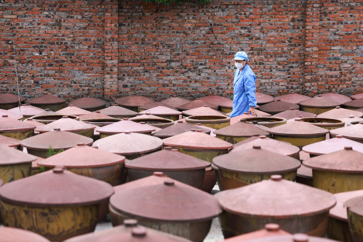 工人们一遍遍翻搅着缸中的豆瓣
