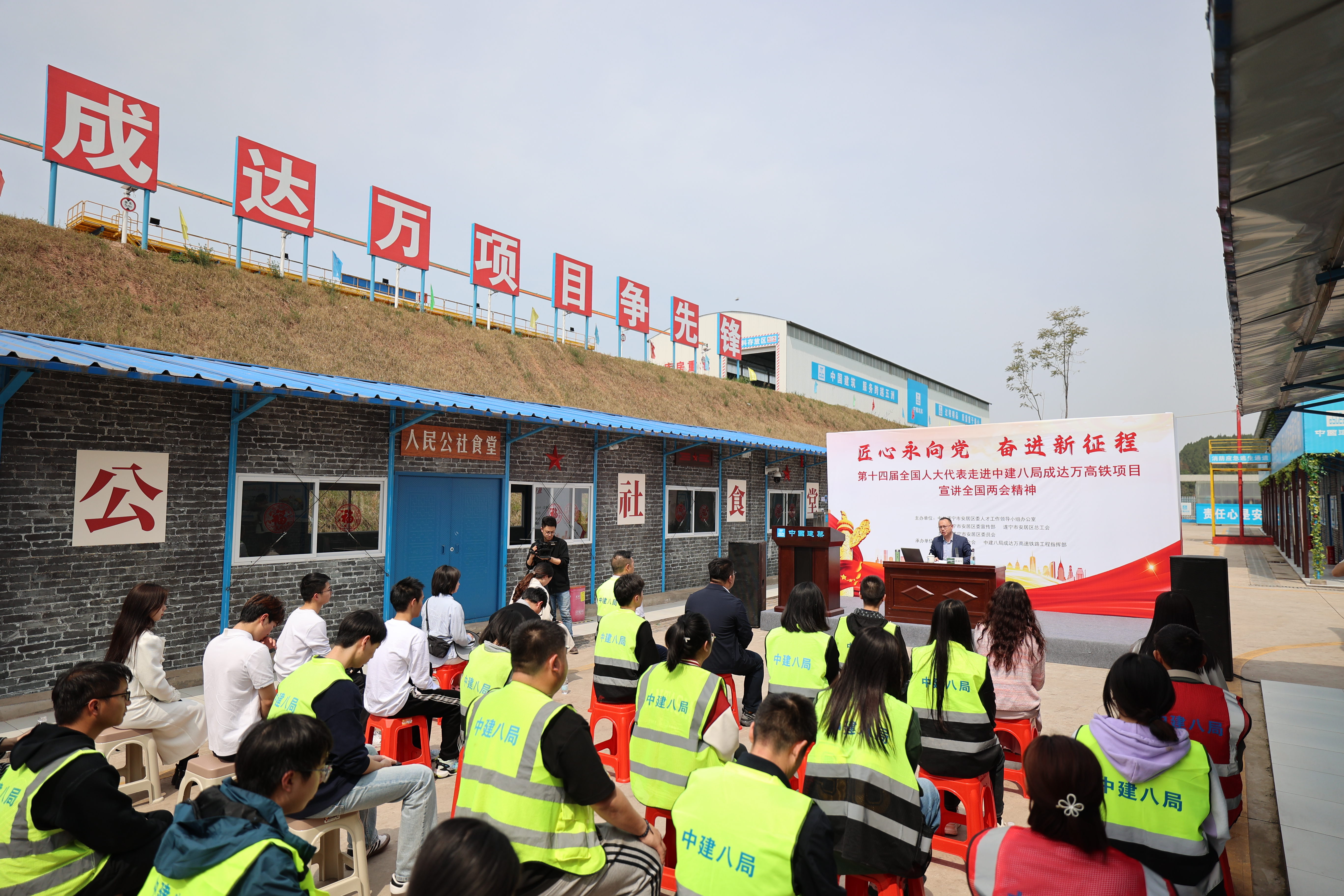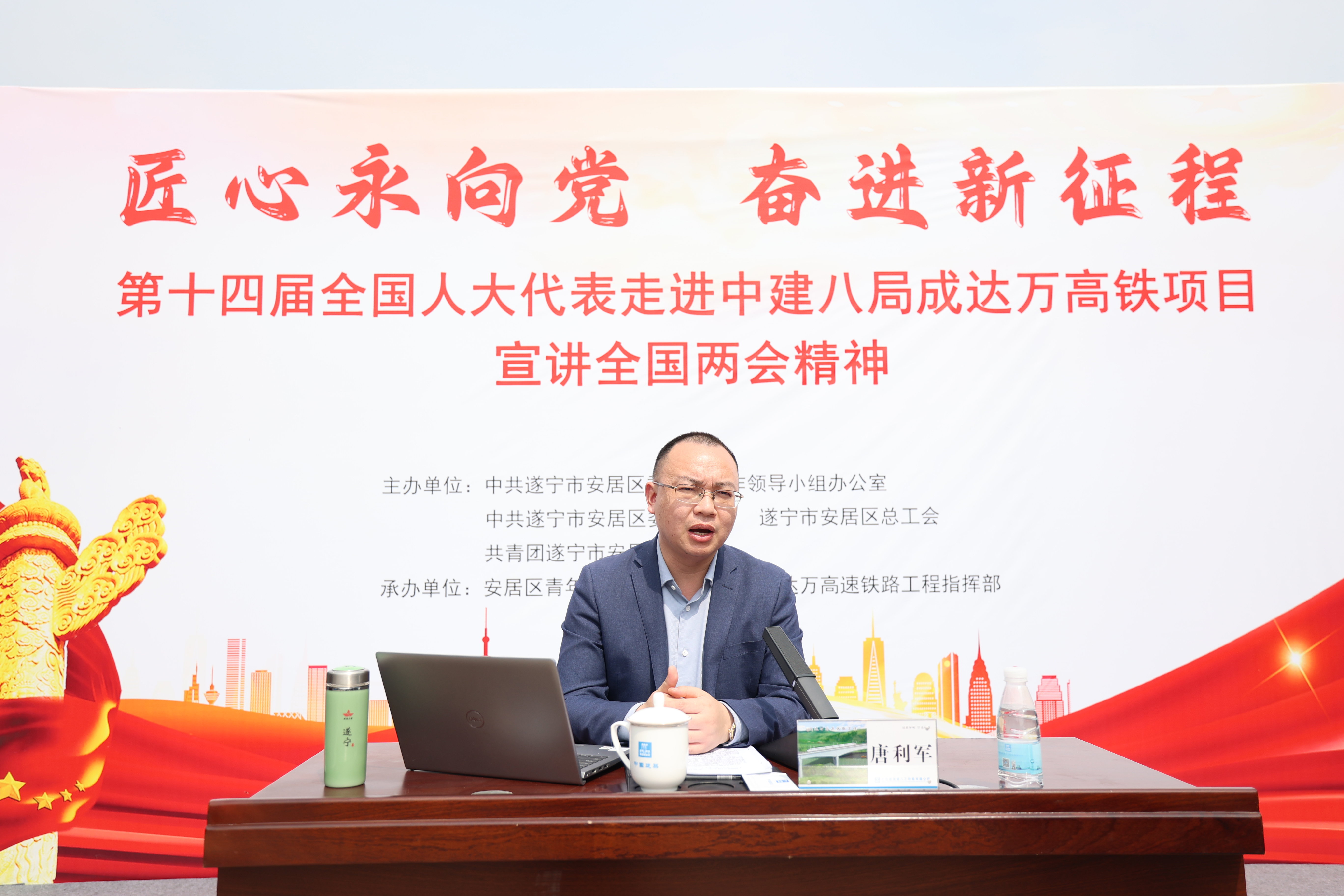 3月22日,全国人大代表、四川职业技术学院教授唐利军走进中建八局成达万高铁项目安居制梁场建设者小镇,分享履职感受,宣讲全国两会精神。安居区青联委员代表,四川职业技术学院汽车学院、遂宁工程职业学院学生代表,项目一线青年职工代表参加此次活动。