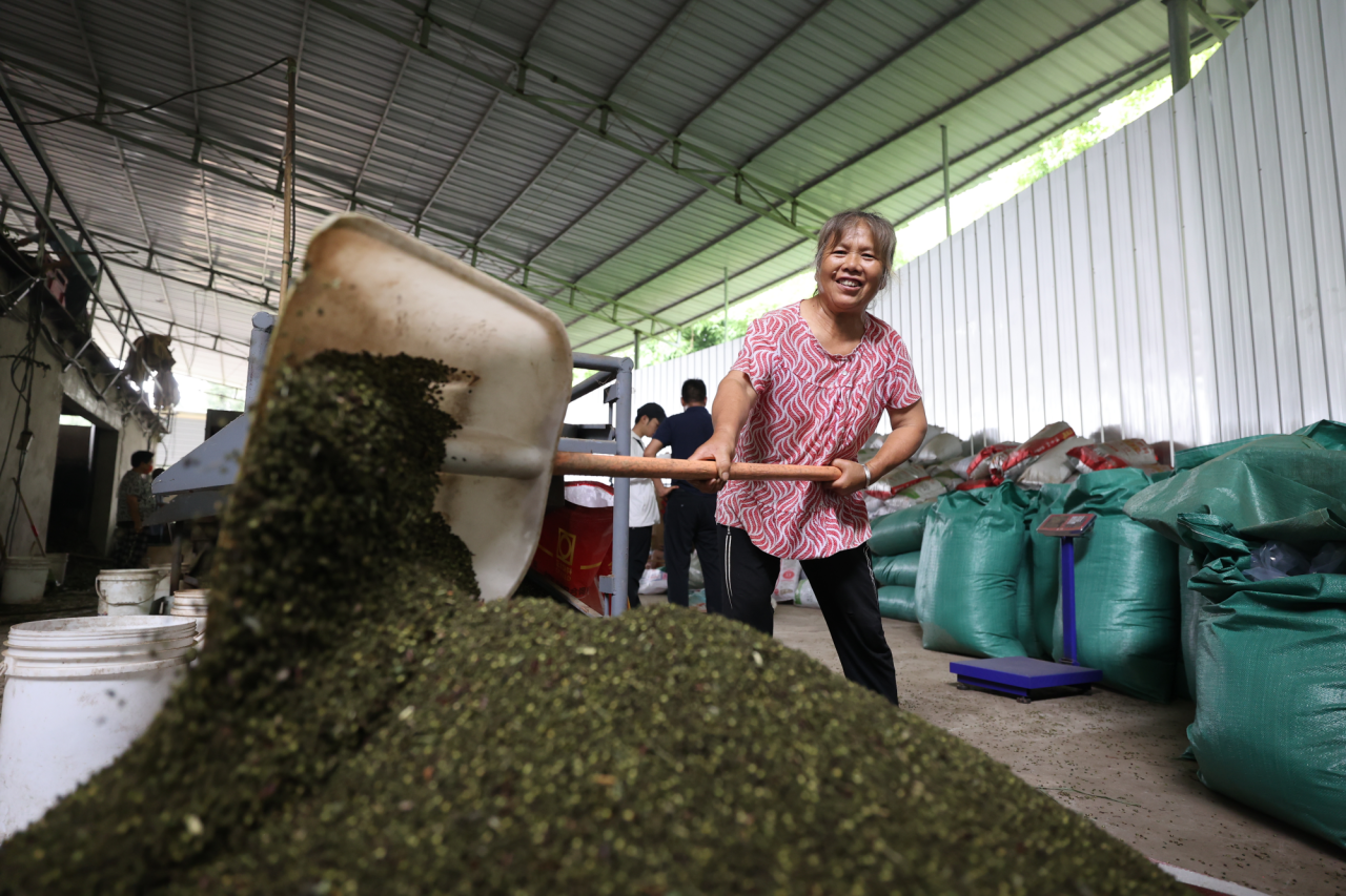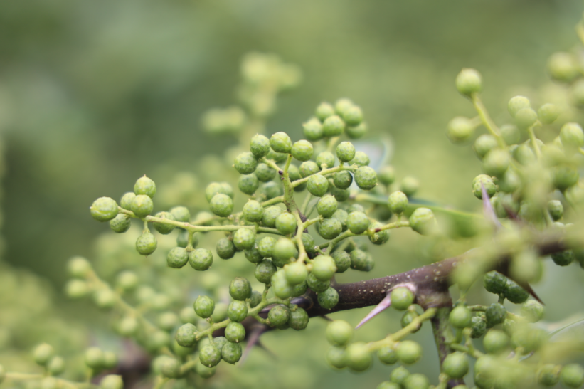 在不远处的烘干中心,机器隆隆作响,刚刚采摘下来的花椒直接运送到厂房,经过除湿烘干、果枝分离、除杂筛选等工序后,一枝青花椒被拆分为花椒颗粒、花椒籽和花椒叶。
