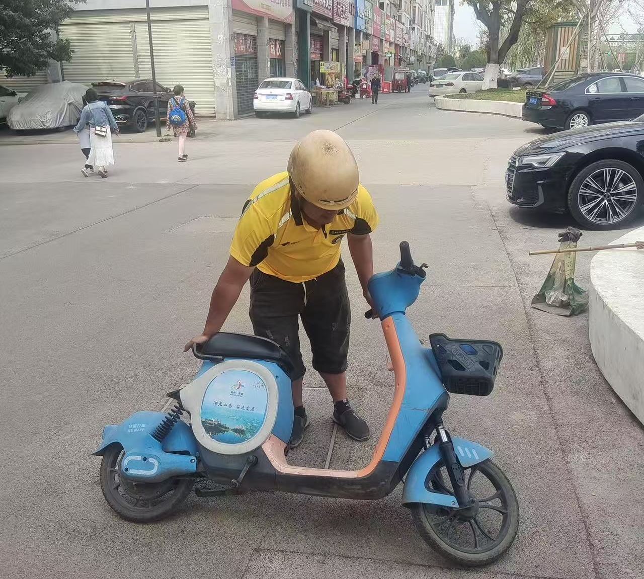 外卖小哥陶杰扶起倒在路边的共享单车
