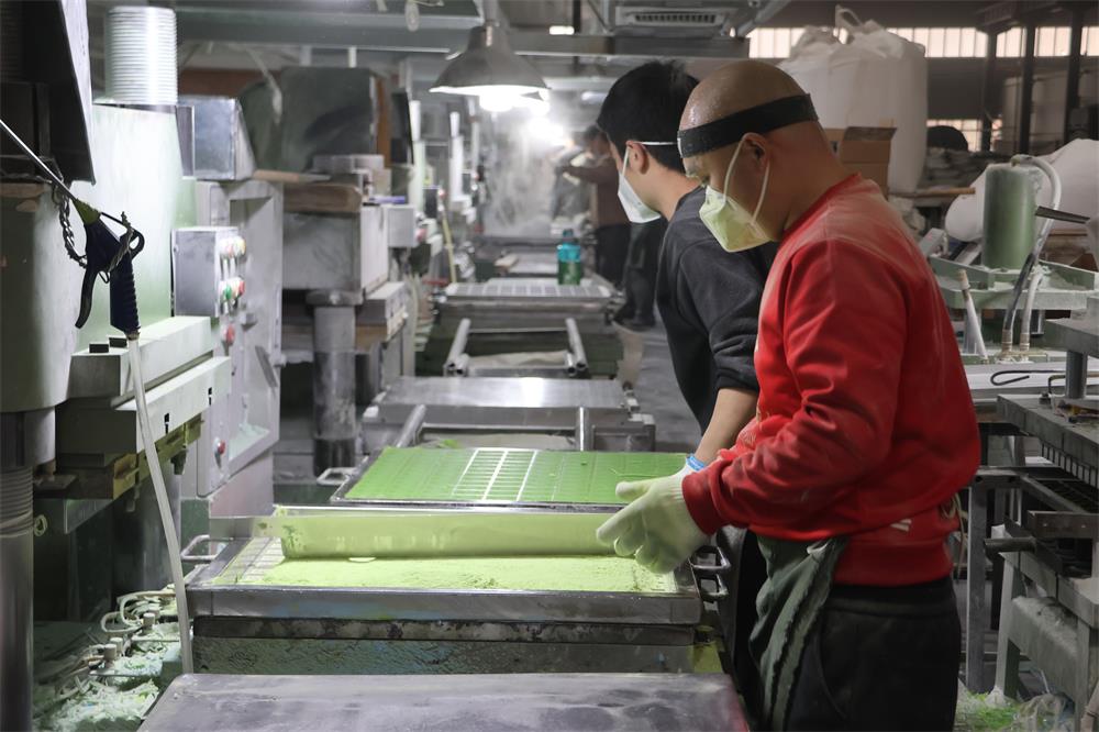 3月4日,在遂宁凰健娱乐设备有限公司的生产车间,经过模压成型、打磨抛光、喷墨上色等环节后的“小方块”相继诞生。一副副拥有不同花色的“小方块”被整齐排列在各个木框内,等待着被打包然后运往各地。