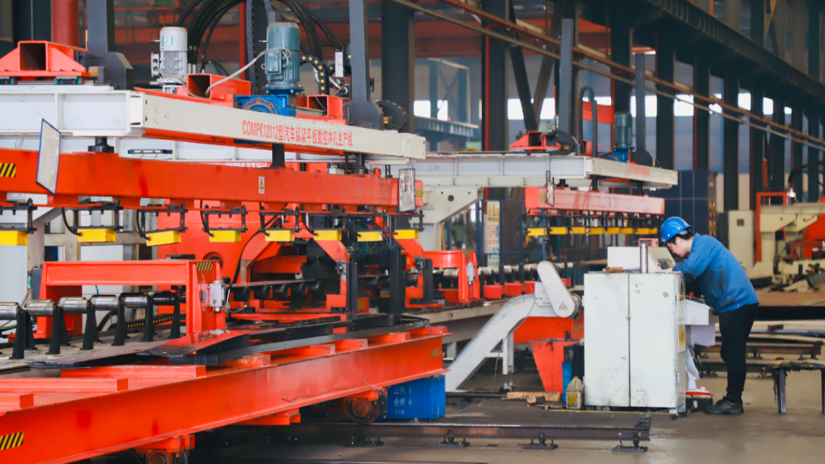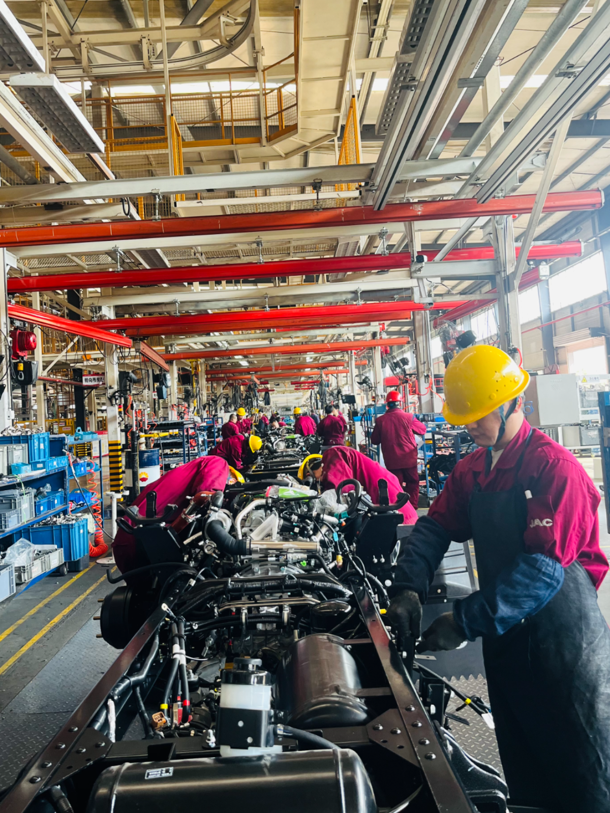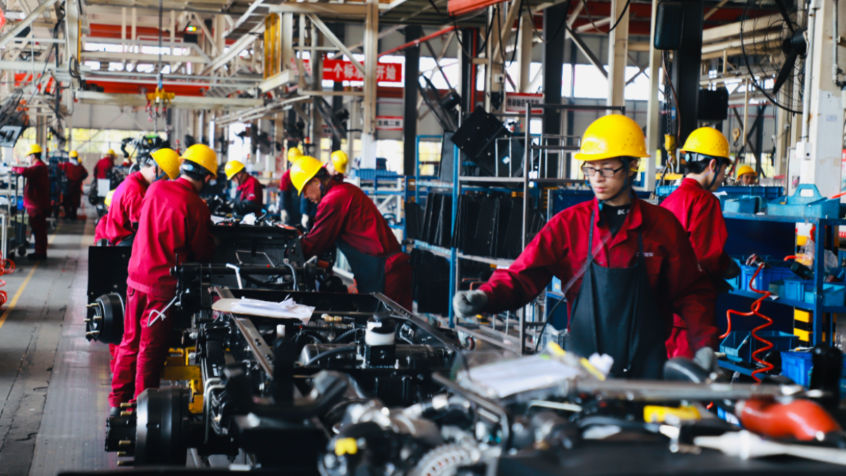 3月21日,在四川江淮汽车公司专业厂总装车间内,各类机械轰隆作响,底盘合装线上,陈列着待组装车体的传送带缓慢前移,穿着红色工作服的工人们在各个车体间来往穿梭,有条不紊地拿着工具对各个车体进行组装......