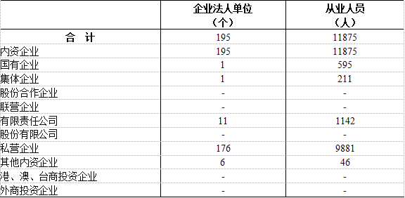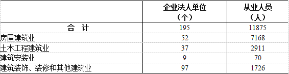 建筑业企业法人单位中,内资企业195个,占100.0%。其中,国有企业占内资企业的0.5%,集体企业占0.5%,私营企业占90.3%。