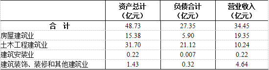 2023年末,建筑业企业法人单位资产总计48.73亿元,比2018年末增长190.2%。负债合计27.35亿元。全年实现营业收入34.45亿元(详见表3-7)。