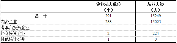 在工业企业法人单位中,内资企业288个,占99.0%;外商投资企业2个,占1.0%。
