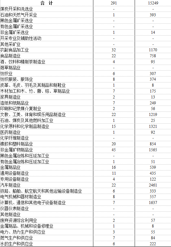 在工业企业法人单位中,采矿业2个,制造业273个,电力、热力、燃气及水生产和供应业16个,分别占0.7%、93.8%和5.5%。在工业行业大类中,非金属矿物制品业、农副食品加工业、汽车制造业企业法人单位数位居前三位,分别占15.5%、11.0%和7.6%。