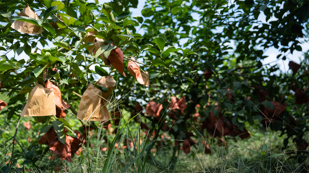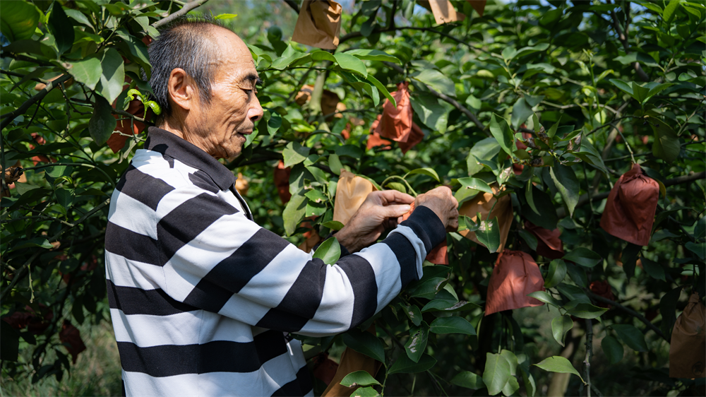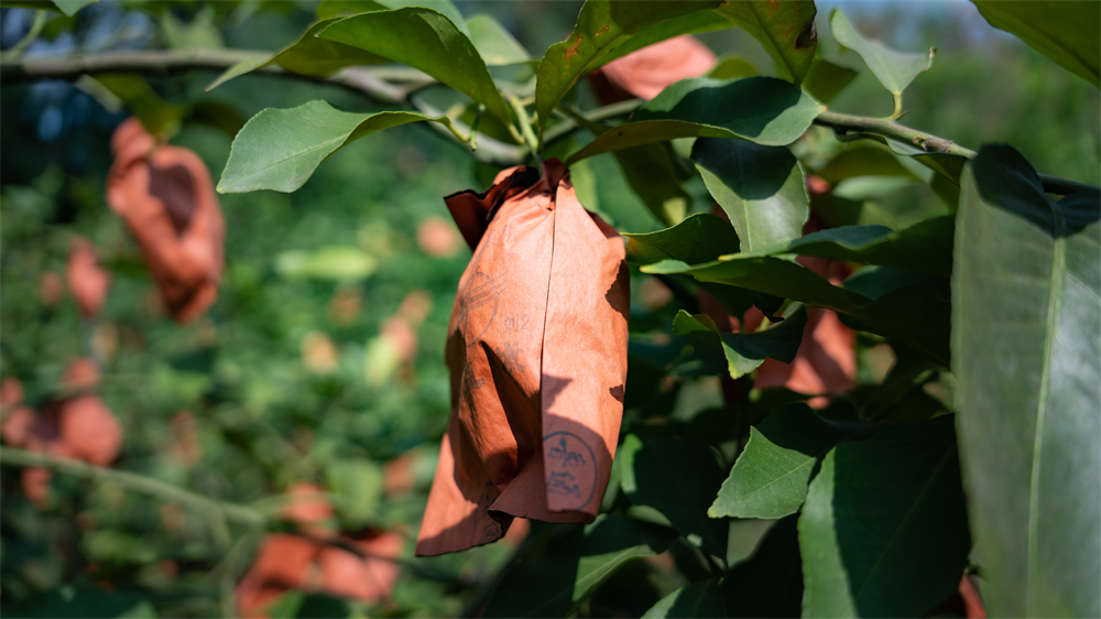 在村子另一边的柠檬产业基地,大片柠檬树映入眼帘,在阳光的照耀下,显得格外翠绿,散发出淡淡的清香。村民们正熟练地给柠檬穿“外套”,不一会儿,统一的黄色纸袋将成片的果树装扮成一道独特的风景。