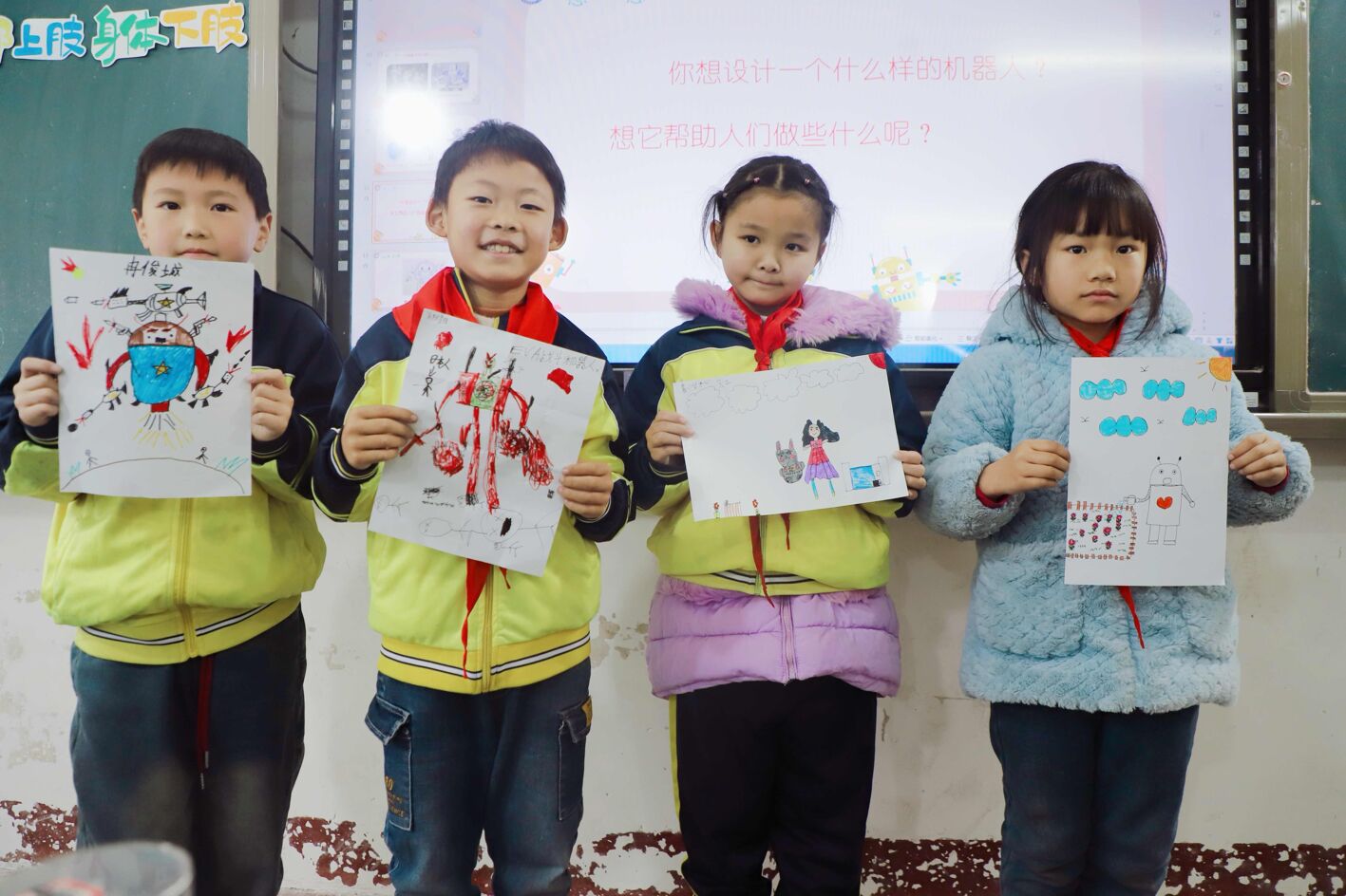 近日,在距离安居城区30余公里的磨溪镇中心小学校三年级(2)班,走教老师金红海正在给同学们讲解机器人的作用、构造以及引导他们描绘出自己心中的机器人模样,课堂上洋溢着欢乐的气氛。