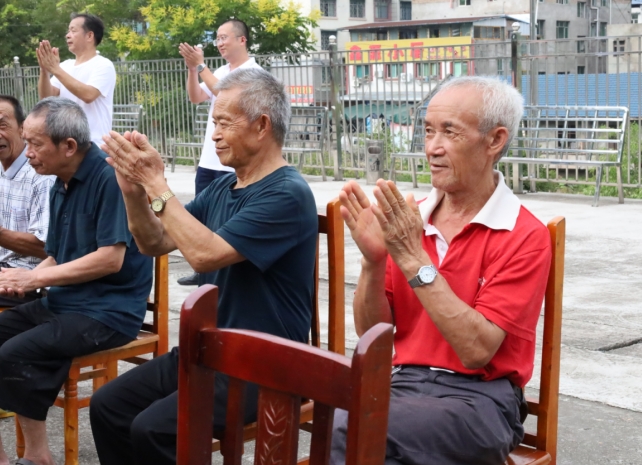 表演者们在台上卖力地演出,快乐喜庆的氛围感染了现场的每一位老人,“我们已经去到了三个乡镇表演节目,看到他们看得认真,我们表演起来也非常的开心,希望在中秋来临之际,能给他们留下美好的记忆。”跳歌伴舞的彭英阿姨说。