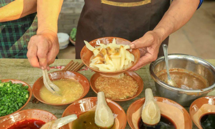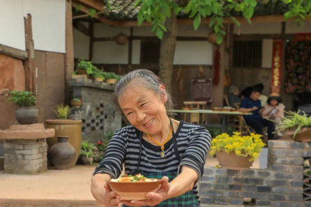 谢婆婆原名谢旗英,是当地制作凉粉的名手,她家的凉粉由豌豆制成,全程手工制作,配料也是由自家菜园里种植的小葱、姜、蒜等制成,同时还有家人亲手制作而成的黄豆豉,醇香味美,滋味悠长。