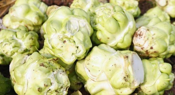榨菜地里,村民们拿着镰刀一刀一个便砍掉了榨菜的根,随后一手握住榨菜头,一手用刀快速把榨菜叶削去,只剩下一个嫩生生的榨菜头,随手便扔进身旁的筐子里,动作十分麻利。